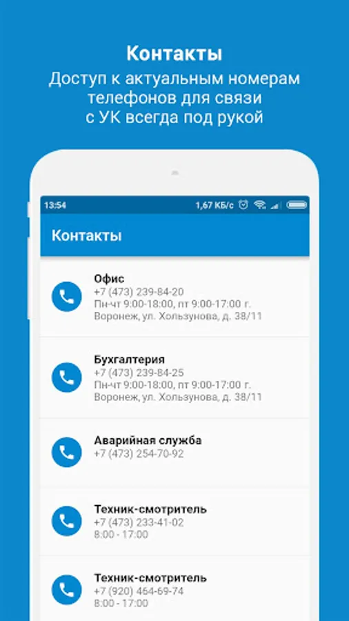 • View contacts and quickly make calls to current phone numbers for communication with the management company;