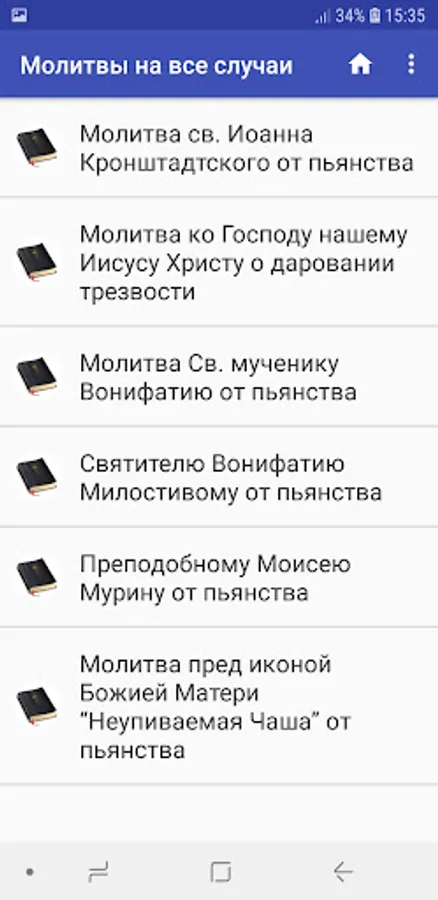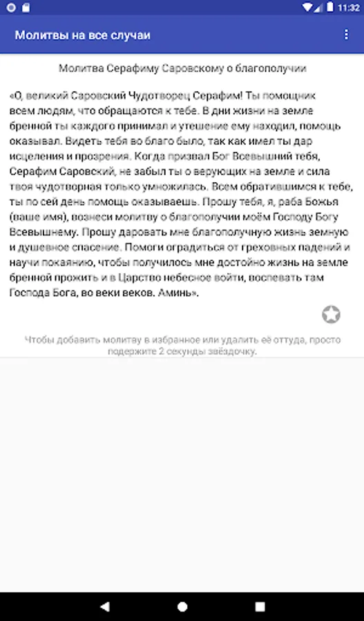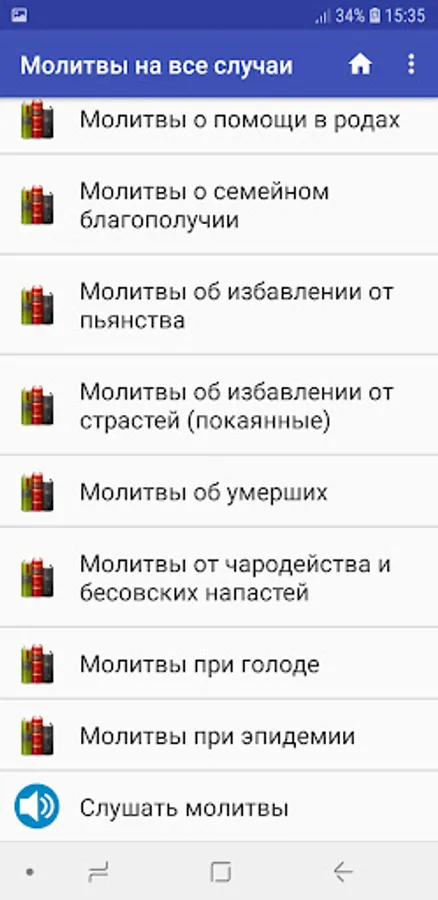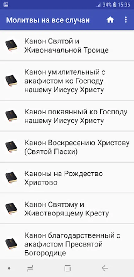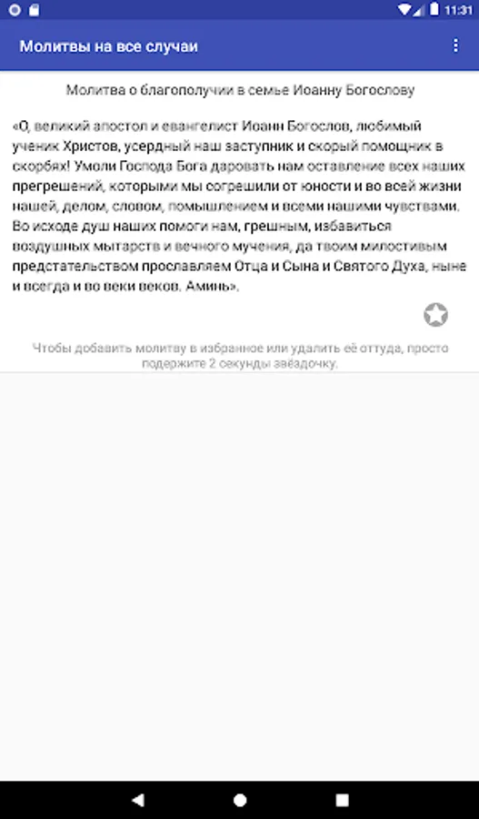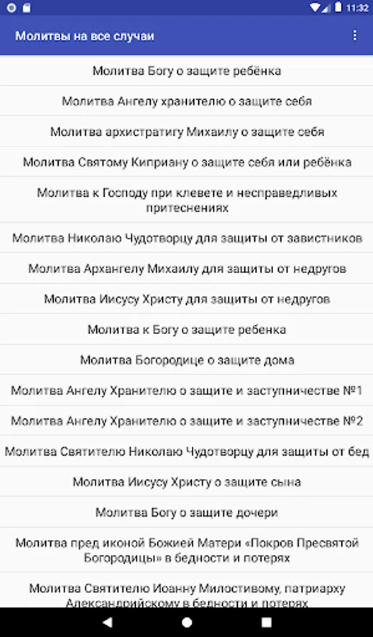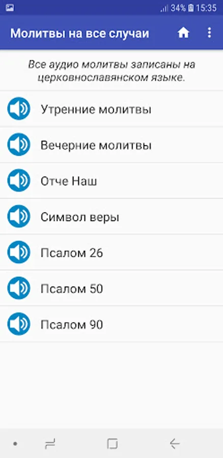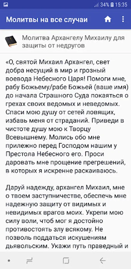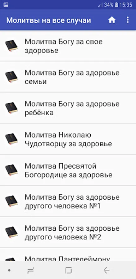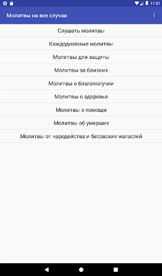 This application contains the most common Orthodox prayers that are most often used by people in everyday life. For example, prayers for health, for success in business, for getting rid of spoilage, and many others. We recommend that you install the application and see for yourself. If you think that you need to add some new prayer to the application, then write about it in the comments, we will do it. Prayers to the guardian angel, prayers for good luck and success, prayers to Nicholas the Wonderworker - you will find all this and much more in this application. Collected only the most necessary, works without the Internet. Download the application and make sure that it is optimal for all occasions. All prayers are in modern Russian, the adaptation from Church Slavonic is taken from prayer books. A section with audio prayers - the most necessary ones - has been added to the application.