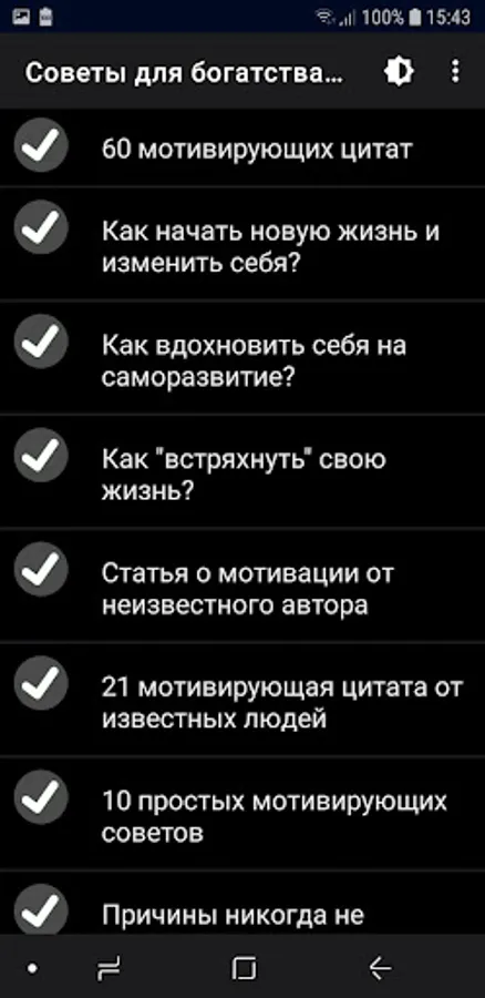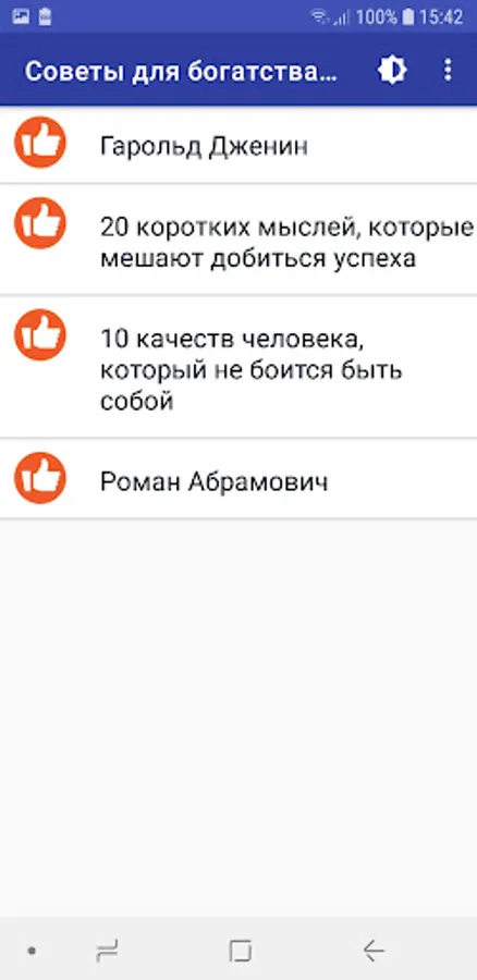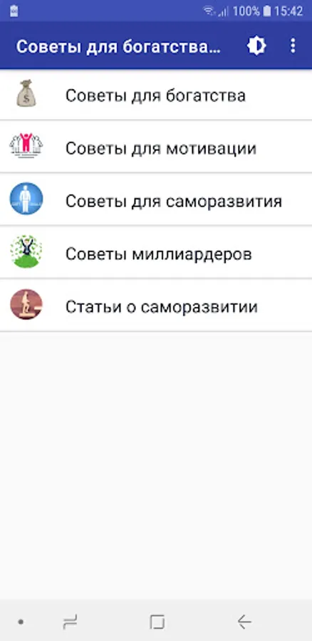 The application contains tips and quotes from billionaires, millionaires and just very rich people who have achieved great success in business. These tips can be used as motivation for making a decision, because the opinion of an experienced person makes sense to find out. Thanks to the application, the user can assess the situation not only from his own point of view, but also suggest how a famous successful person would act in this case.