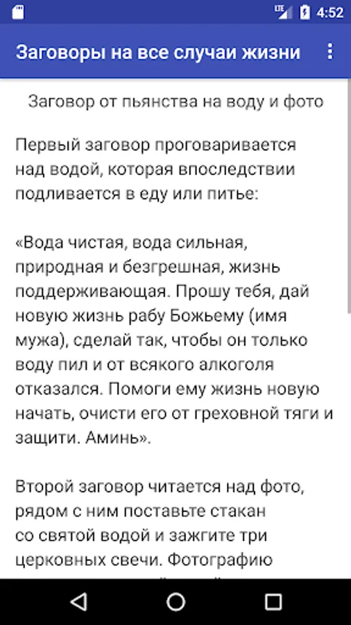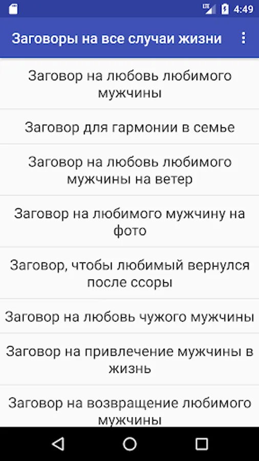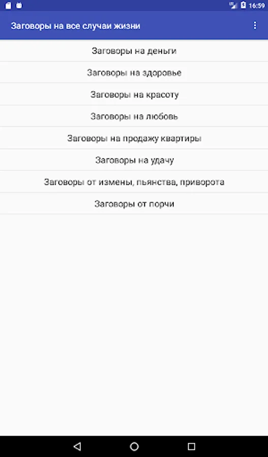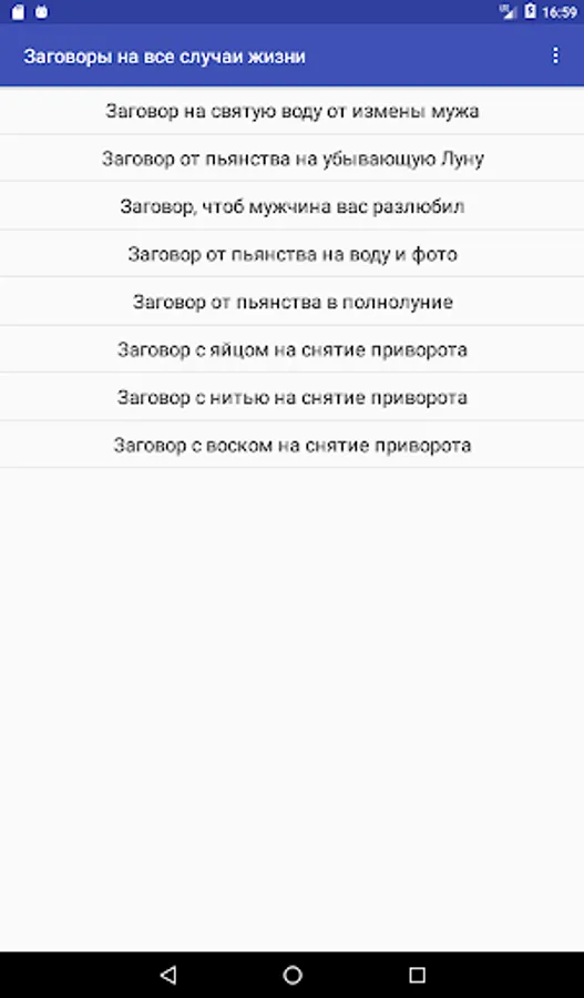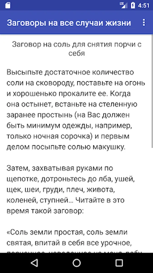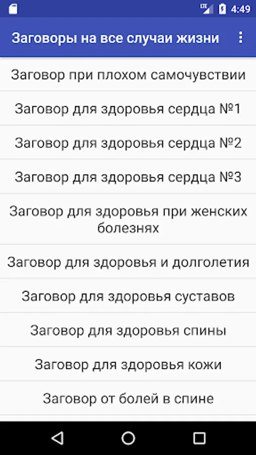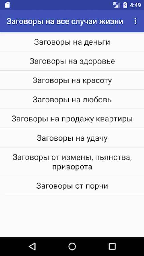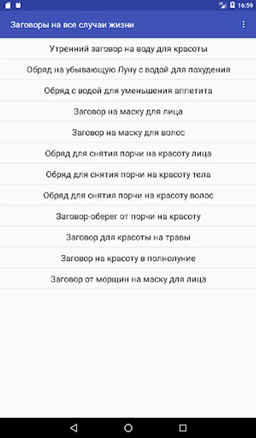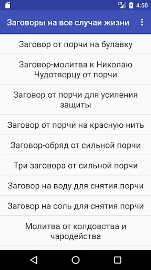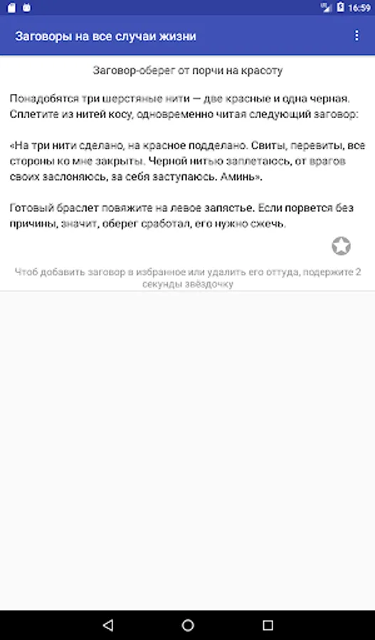 The annex contains various conspiracies and ceremonies of our ancestors, which they used in everyday life. These are conspiracies for good luck, to improve health, from troubles and even from severe damage. By installing this application on your device, you can always have at hand a small collection of the most necessary conspiracies. The application works without the Internet, just install it and use it!