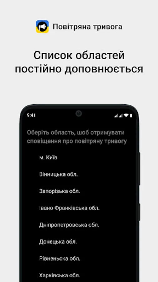 All regions of Ukraine are available in the application, as well as the ability to receive alarms only for the selected district or territorial community.