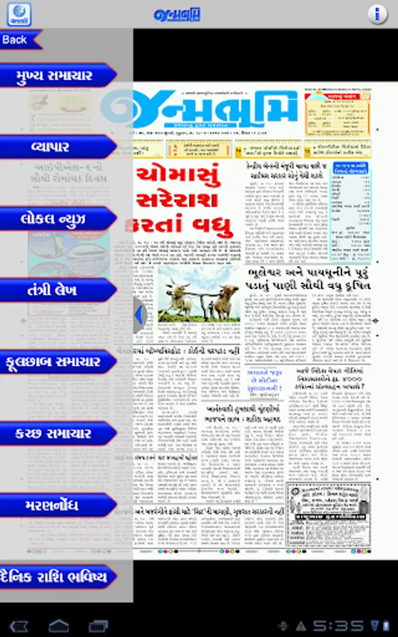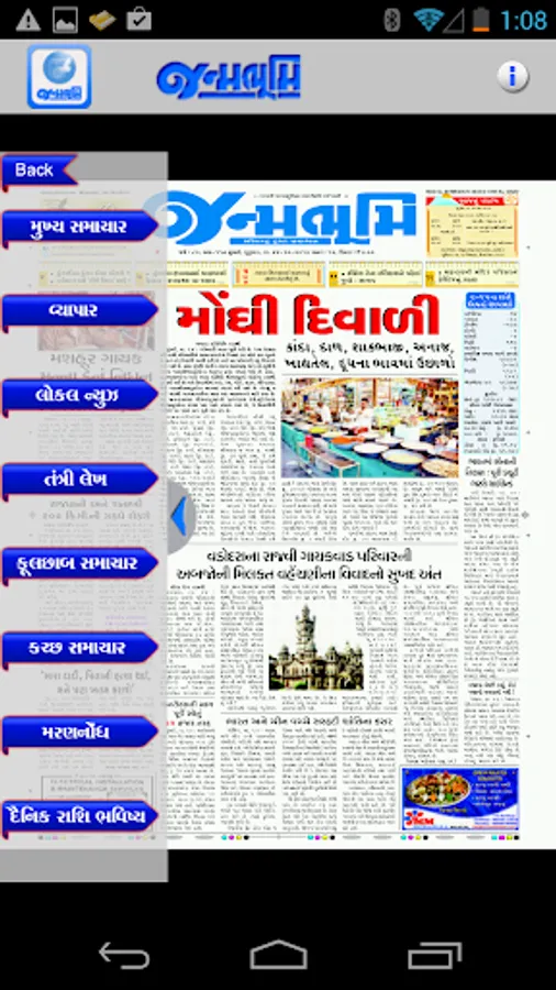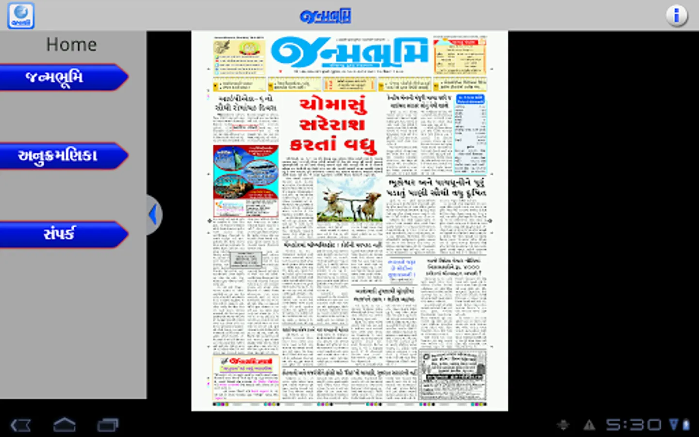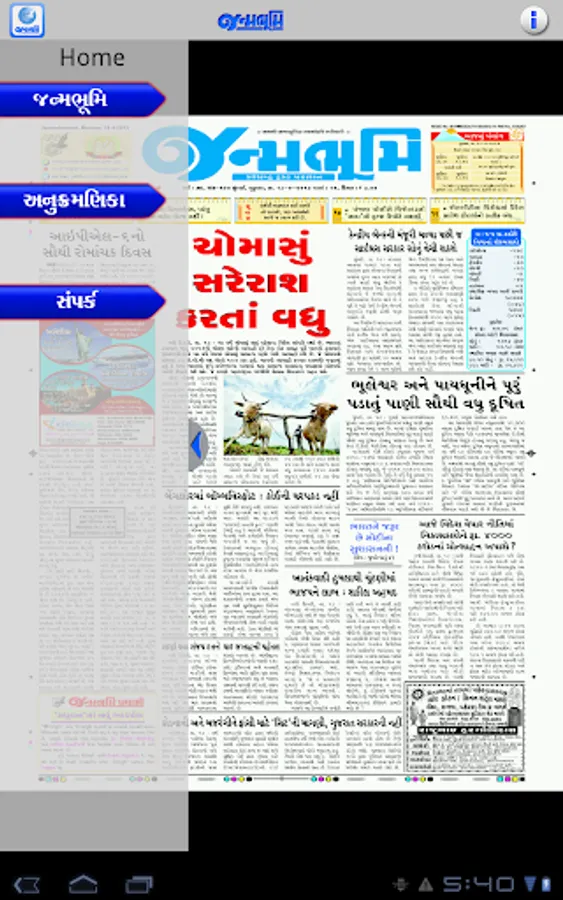 Get the official Android version of Janmabhoomi Gujarati Newspaper right on your Android. The ePaper downloads the entire print edition of the newspaper for offline reading. You can use your finger - tips to "pinch and zoom" the text in articles if you would like to enlarge, or reduce the font size. You can read the edition in portrait or landscape mode.