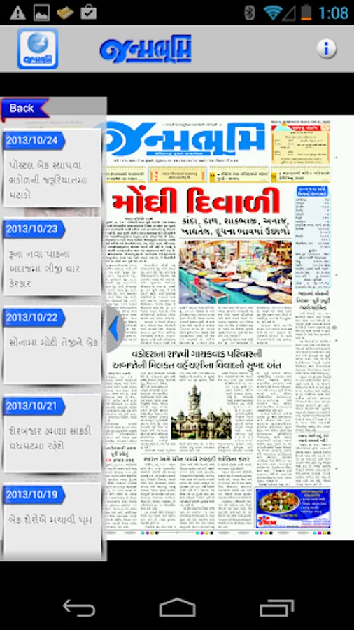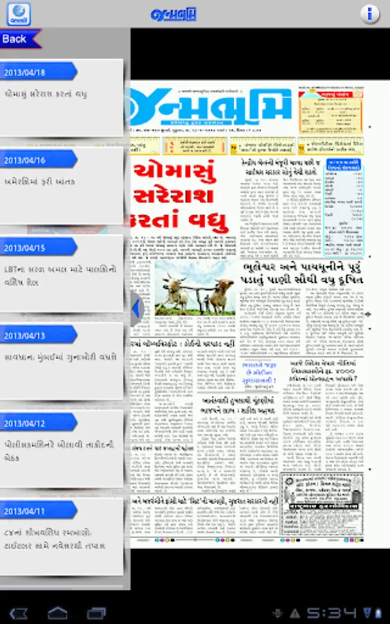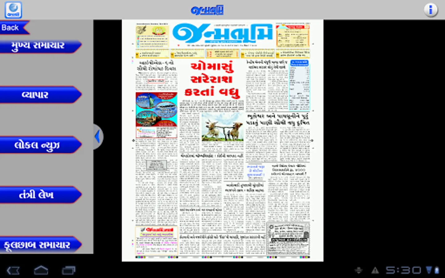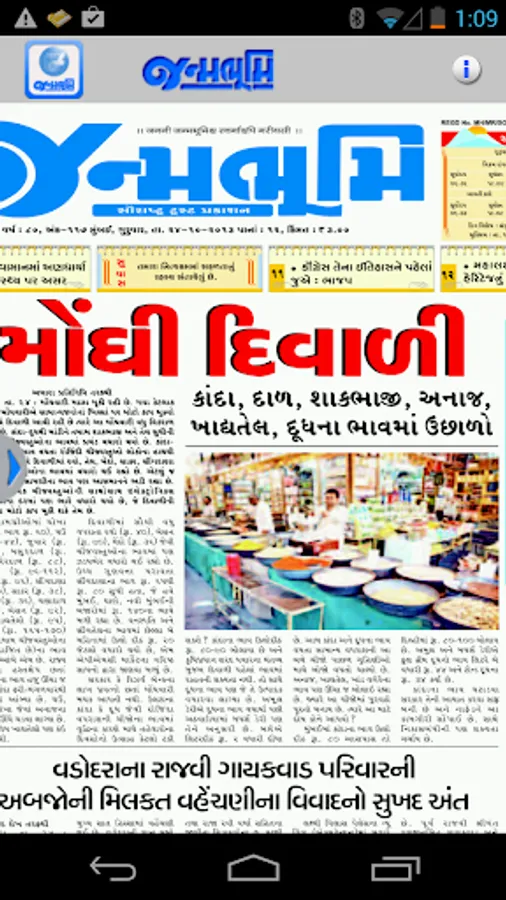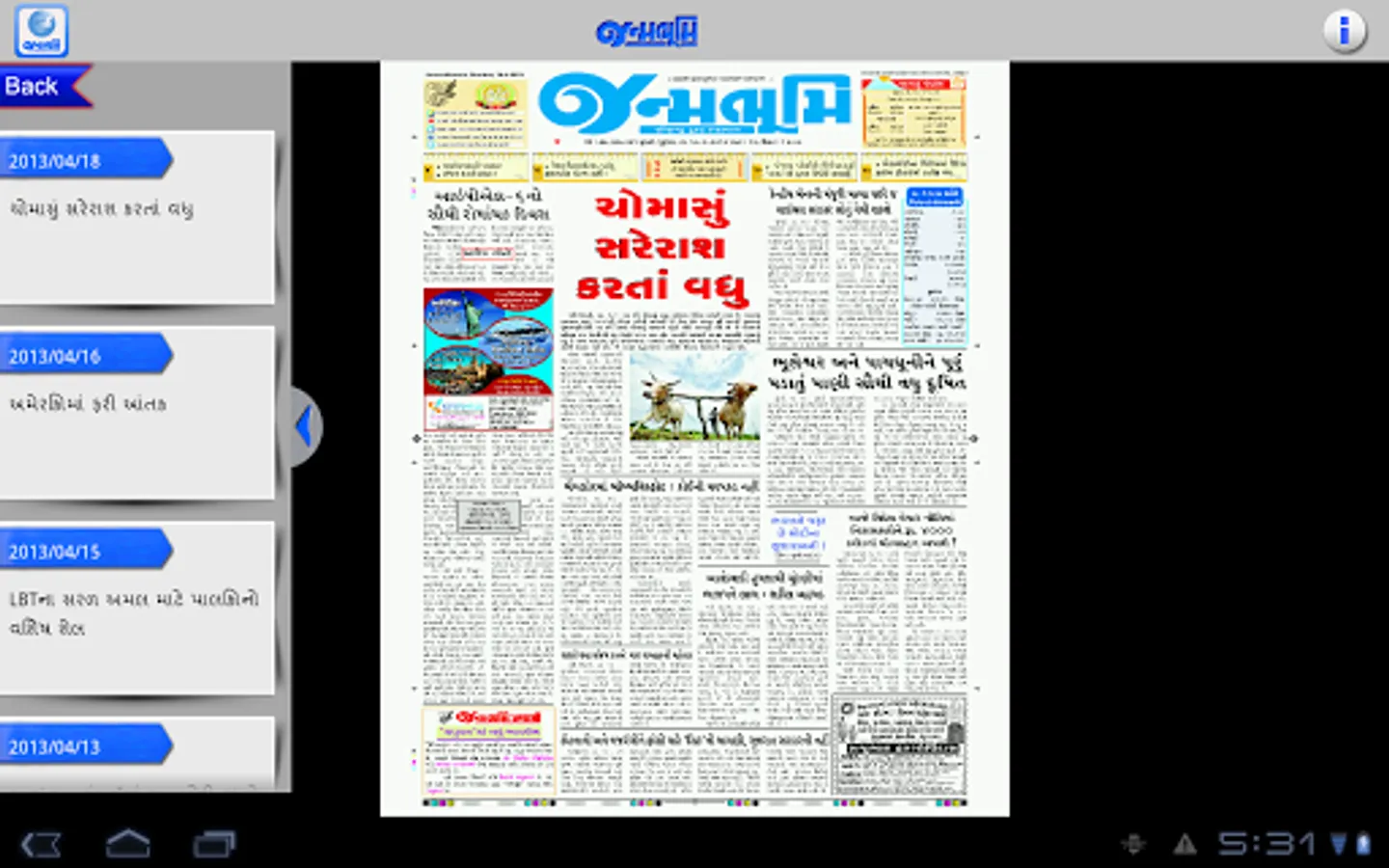 Get the official Android version of Janmabhoomi Gujarati Newspaper right on your Android. The ePaper downloads the entire print edition of the newspaper for offline reading. You can use your finger - tips to "pinch and zoom" the text in articles if you would like to enlarge, or reduce the font size. You can read the edition in portrait or landscape mode.