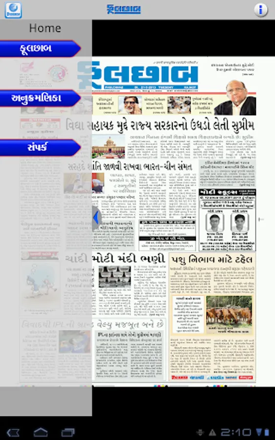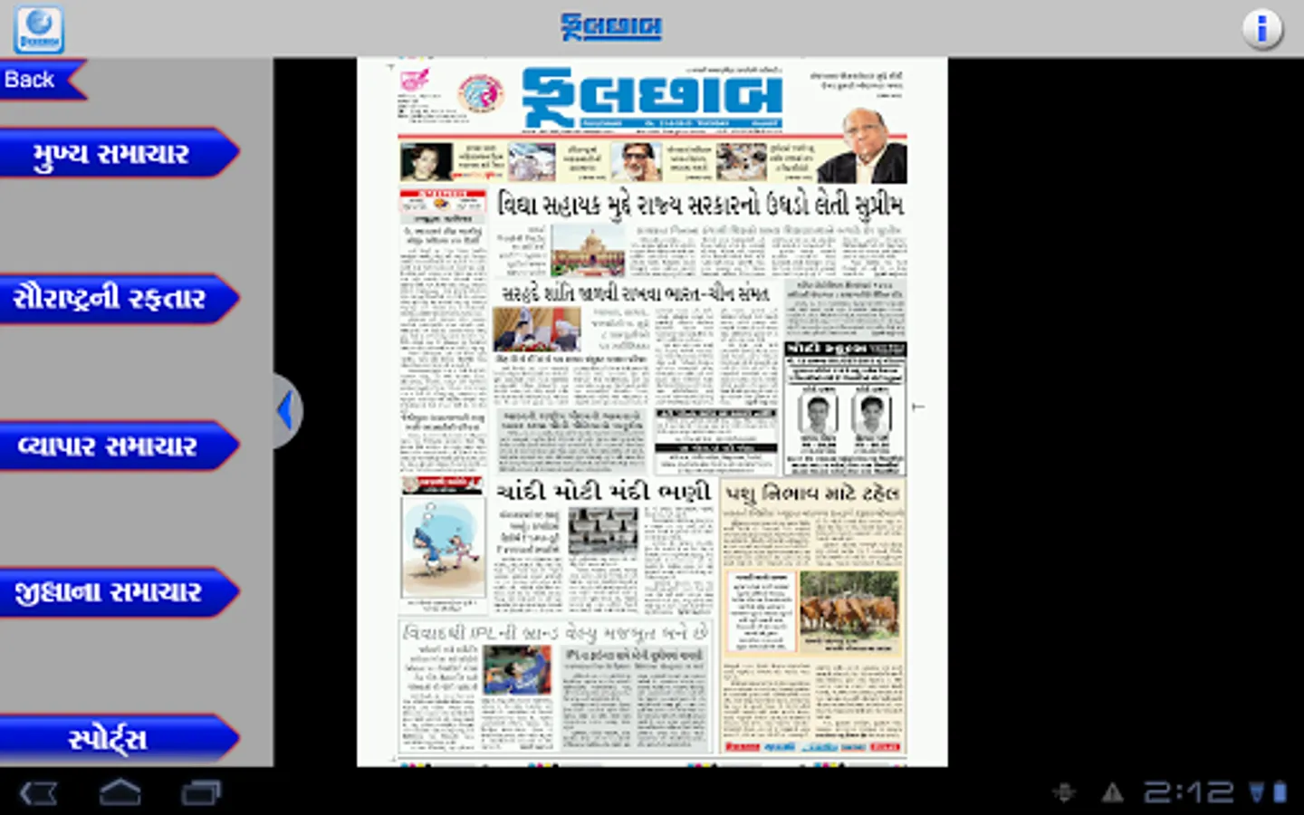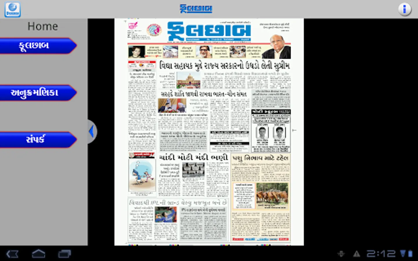 Get the official Android version of PhulChhab Gujarati Newspaper right on your Android .The ePaper downloads the entire print edition of the newspaper for offline reading. You can use your finger - tips to "pinch and zoom" the text in articles if you would like to enlarge, or reduce the font size. You can read the edition in portrait or landscape mode.