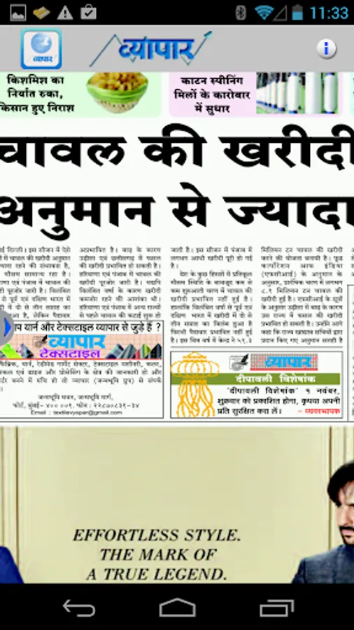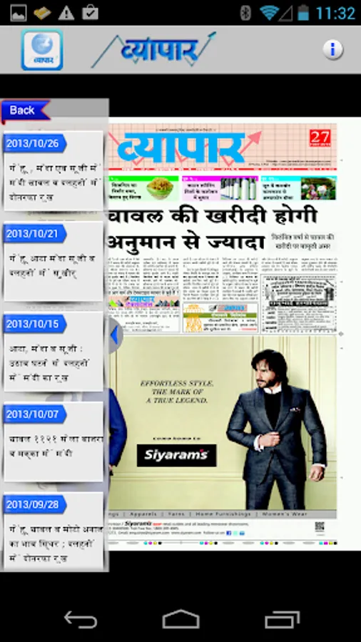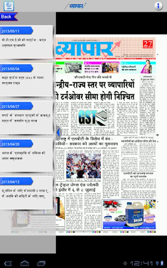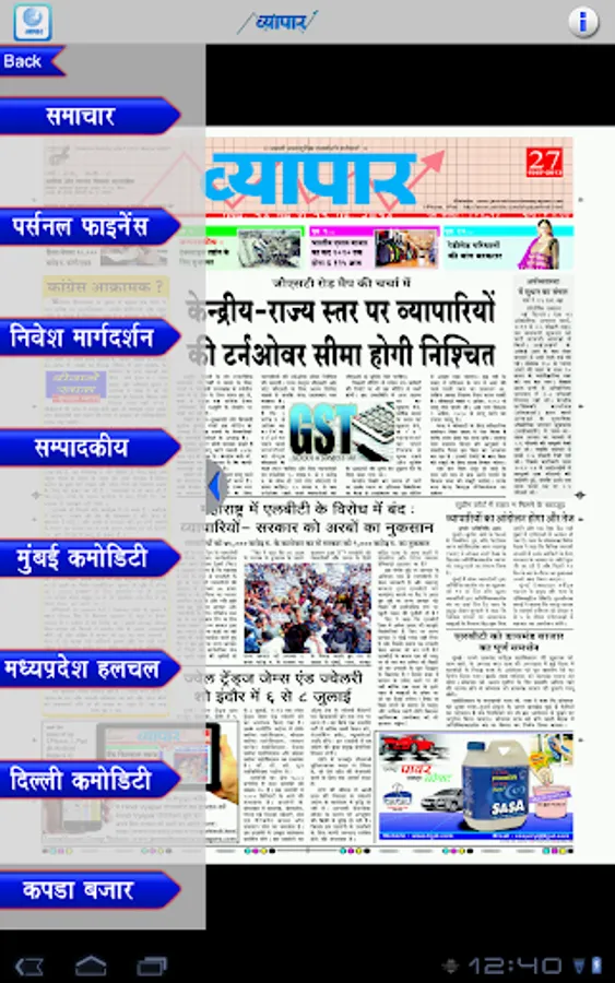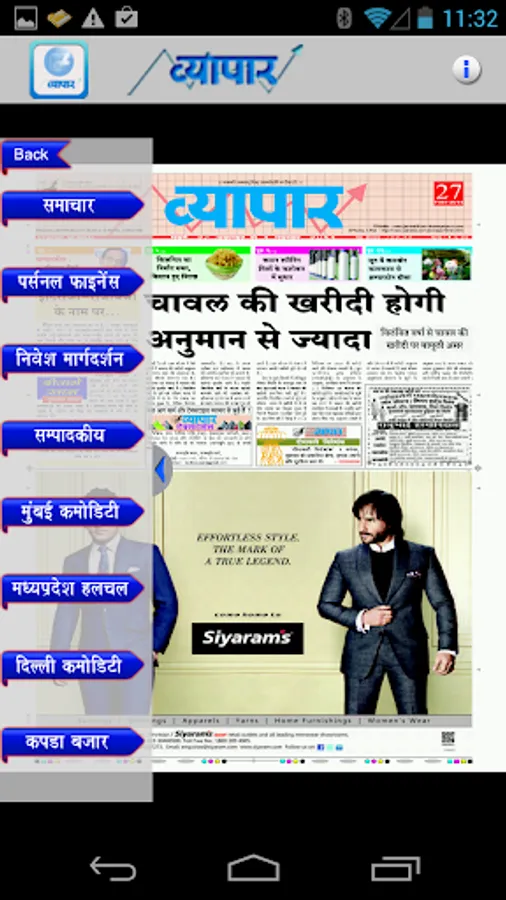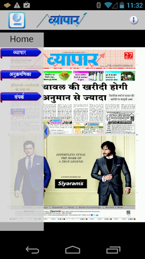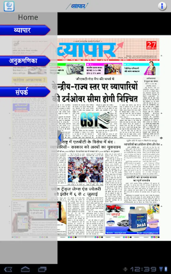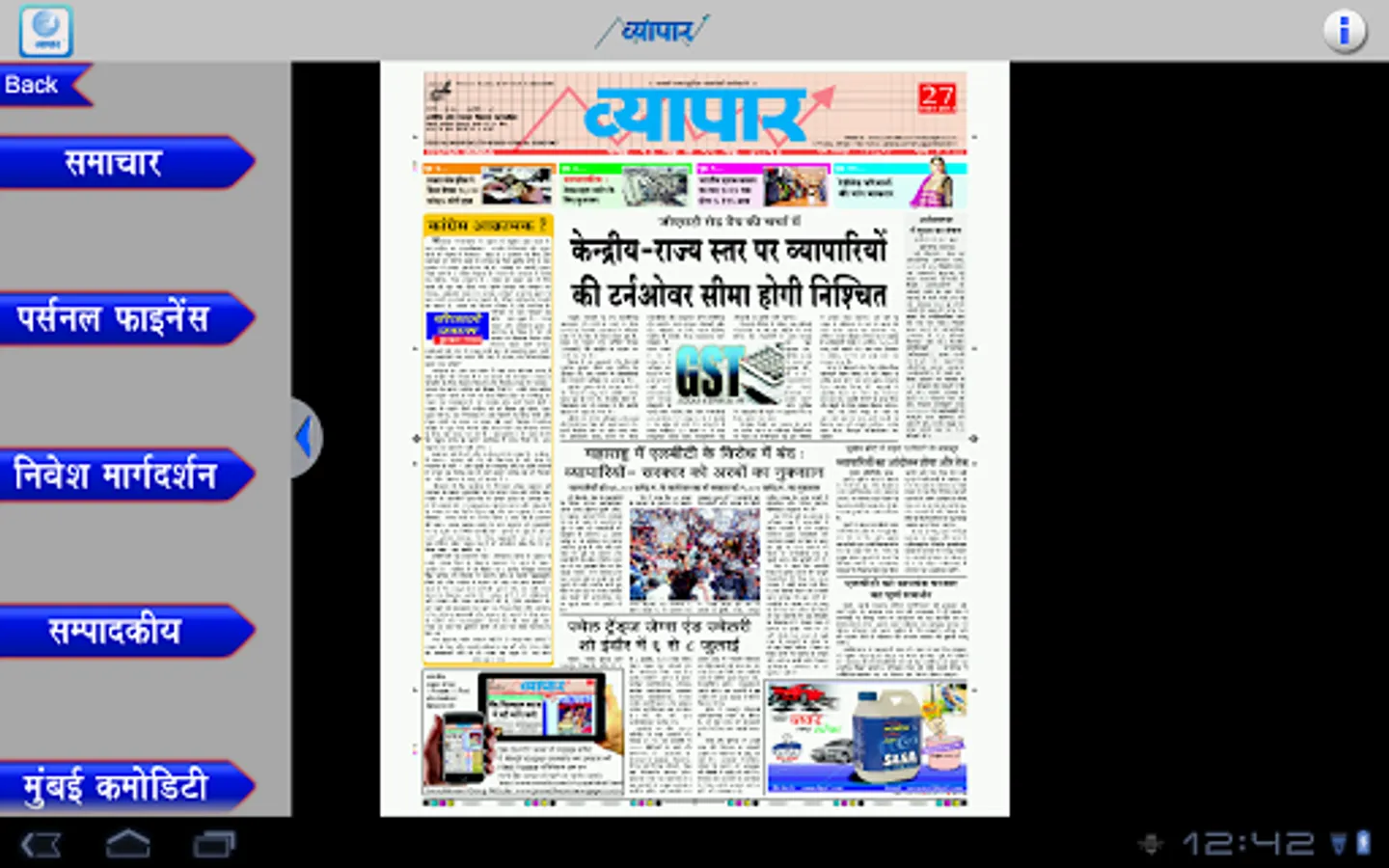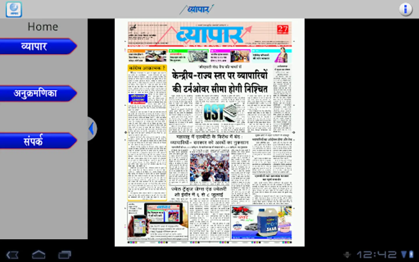 Get the official Android version of Vyapar Hindi Newspaper right on your Android. The ePaper downloads the entire print edition of the newspaper for offline reading. You can use your finger - tips to "pinch and zoom" the text in articles if you would like to enlarge, or reduce the font size. You can read the edition in portrait or landscape mode.