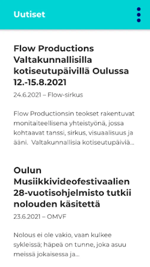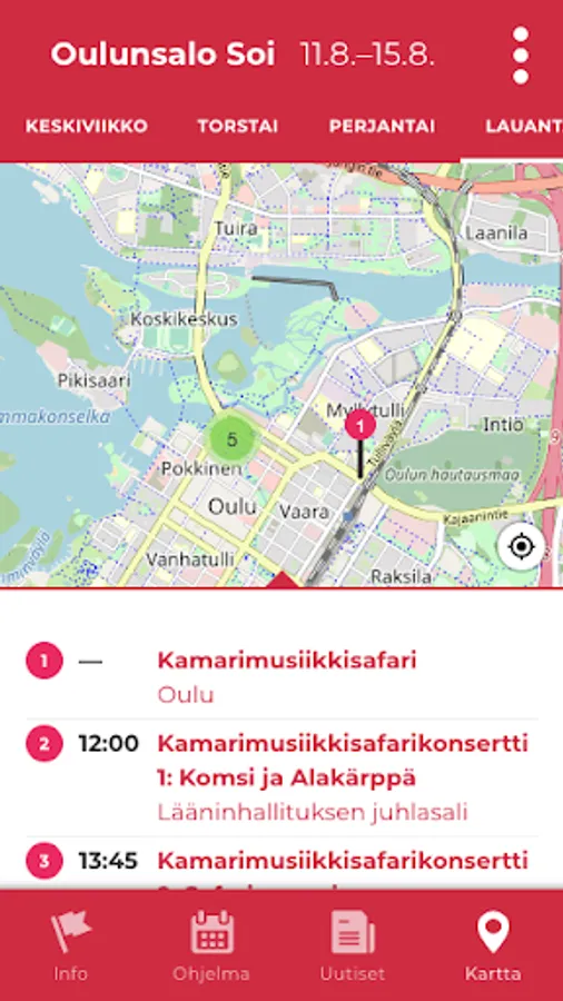In the application you will find about two hundred events of all the festivals belonging to the Oulu Festival and the other program of the Oulu Festival. Mark your own favorites and discover new experiences at cultural festivals in Oulu and the region.