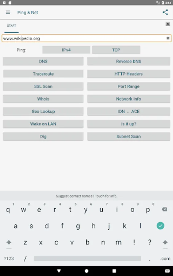 Displays lots of network information and diagnostics: Ping a server (via ICMP over IPv4 or IPv6 and TCP), DNS lookup (with geographical lookup of IP addresses), reverse DNS lookup, WHOIS queries, inspecting HTTP response headers, trace routes (also with IP address geo lookup), check whether a range of ports is open, scan a host for SSL versions and ciphers, perform Path MTU discovery, look up the location of hosts, check whether it's reachable from the public internet, and determine the risk associated with an IP Address. It also shows details of the current network setup and connection of the device, including netstat information. "Wake on LAN" functionality for waking up machines. The optional "NetSentry" monitors network interfaces and warns when usage limits are about to be breached.