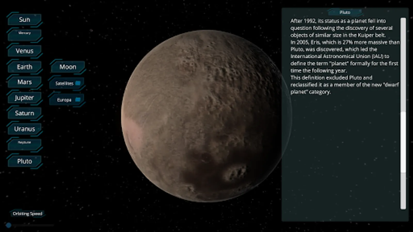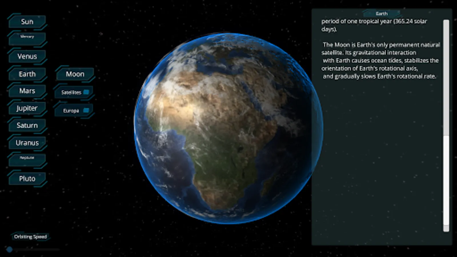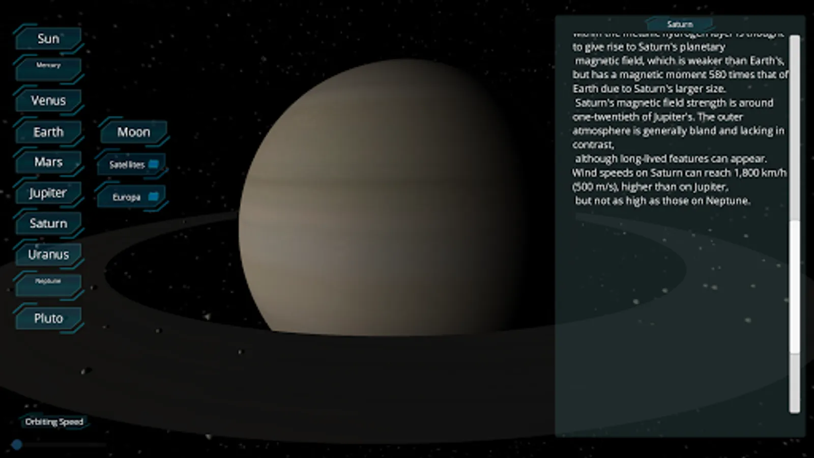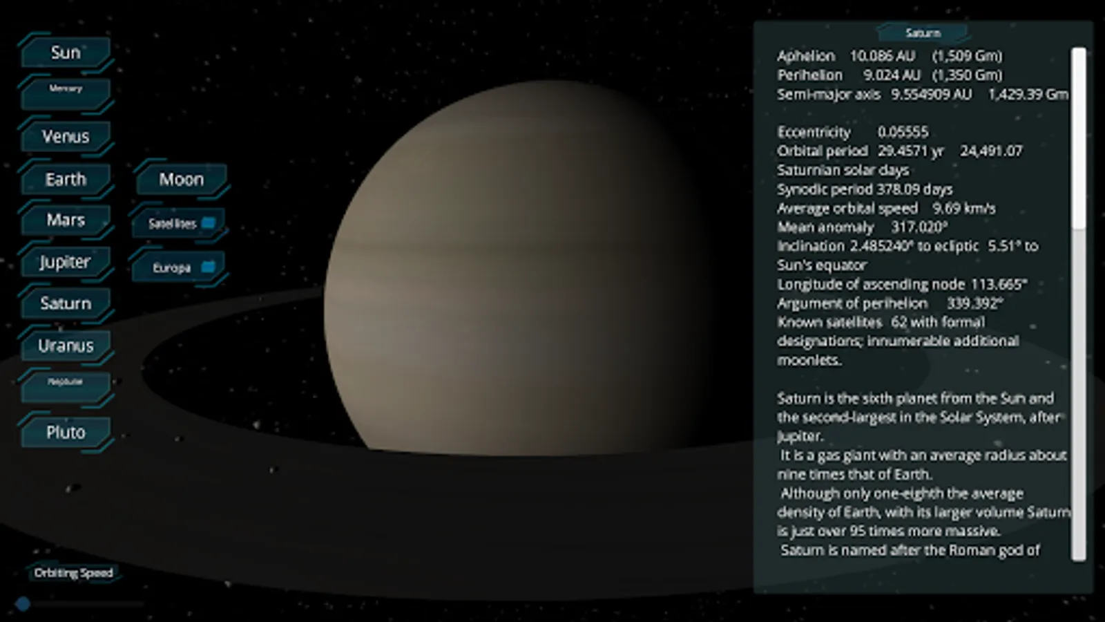 This app also contains information providing Aphelion, Perihelion, Semi-major Axis, Eccentricity, Orbital period, Average orbital speed, Mean anomaly, Inclination, Longitude of ascending node, Argument of Perihelion, and much more about stars, planets, and satellites in our Solar System.