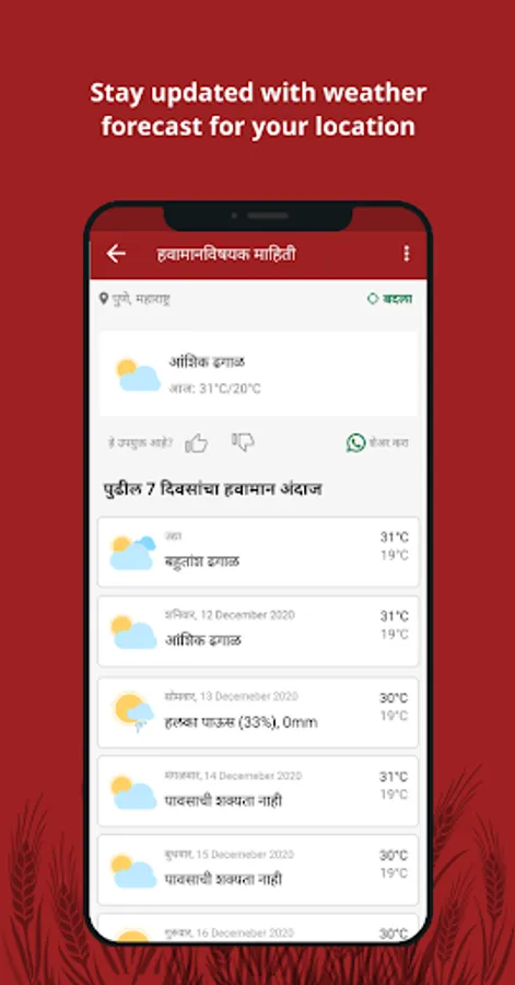 #2. Weather Forecast (मौसम) Agrostar app is having the best weather widget which provides 7 days weather forecast to farmers in advance. Farmers can access weather forecasts based on their location to make smart agriculture choices. Weather updates include rainfall, temperature & humidity. We know extreme weather is an emergency for our Kisan, and send them emergency alerts. Brought to you in association with the world-renowned weather service provider- Accuweather.