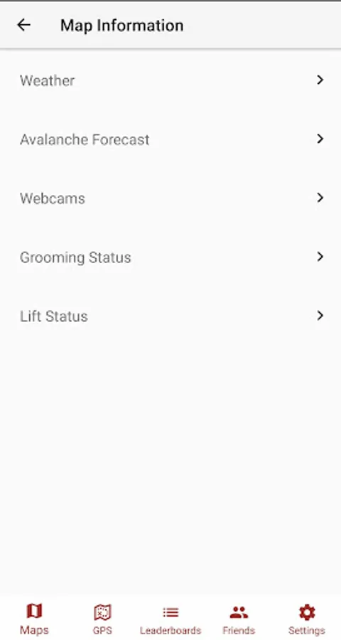 - NEW: Map dependent information links. These information links provide access to much needed information such as weather, avalanche forecast and hazard ratings, grooming and lift status as well as webcams.