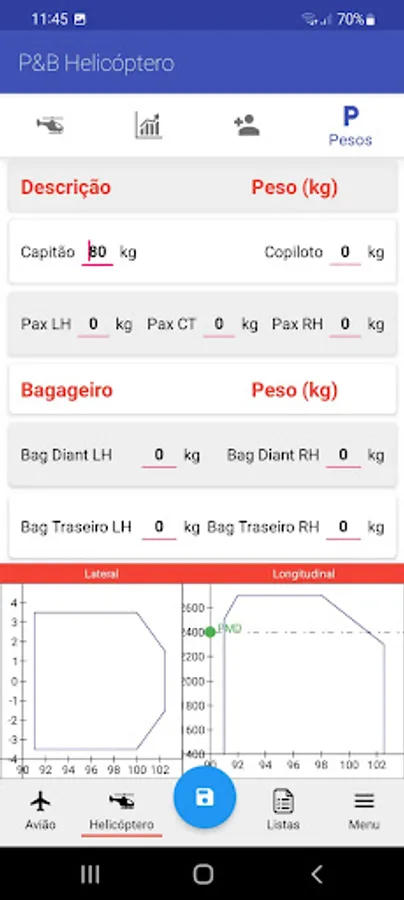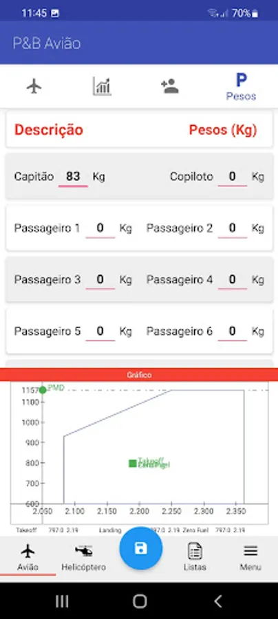 This app is complete. You can weight and balance your aircraft, add passengers to the list and create a PDF file that will be saved on your cell phone.