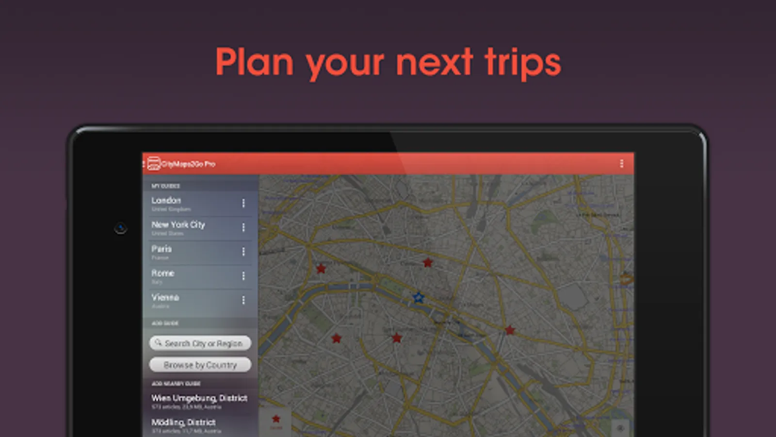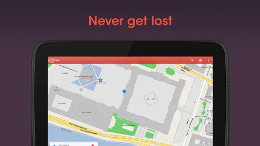 The Paris Offline Map and the Paris CIty Guide content are fully downloaded and stored on your device. All features, such as address searches and your GPS location also work offline and without data roaming (an internet connection is of course required for initial downloading of data or booking hotels).