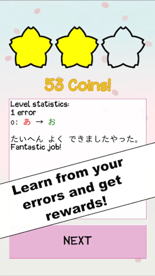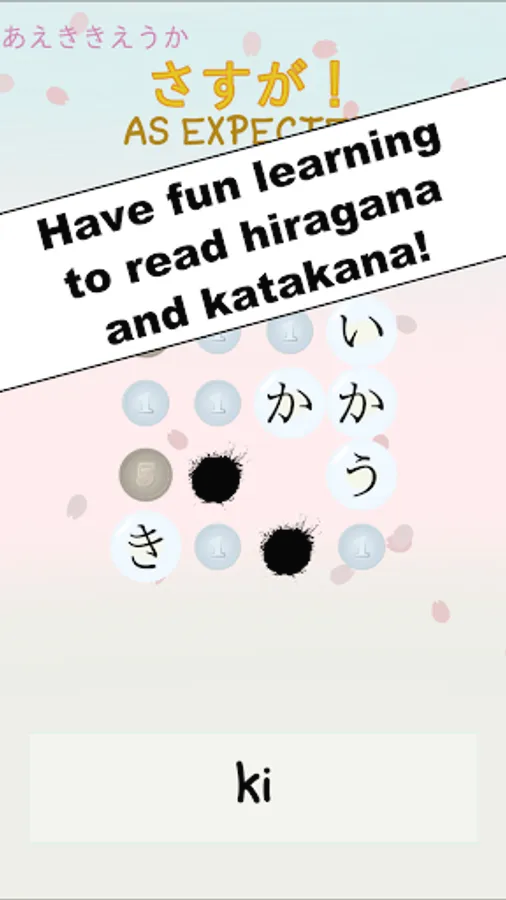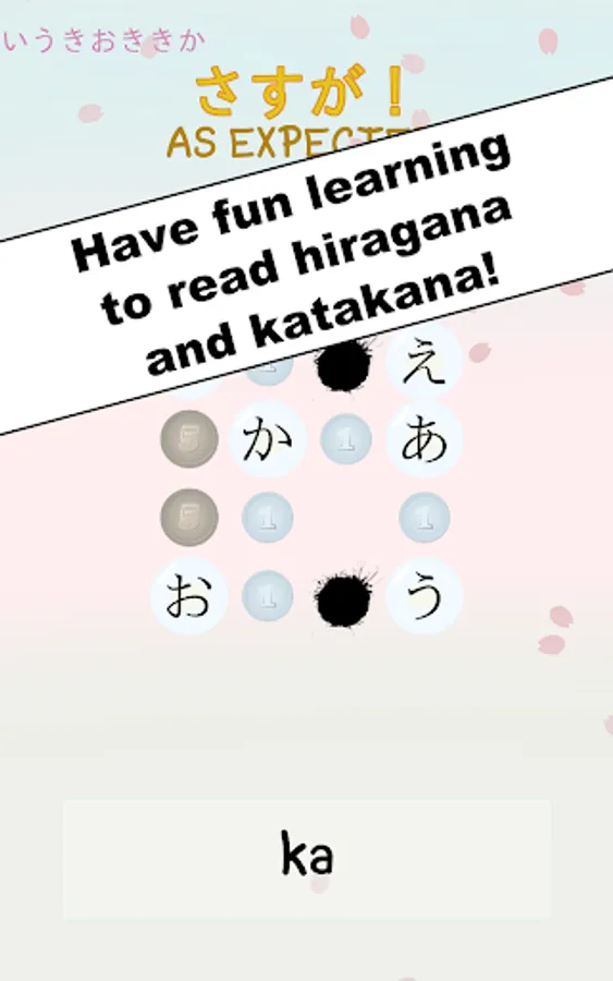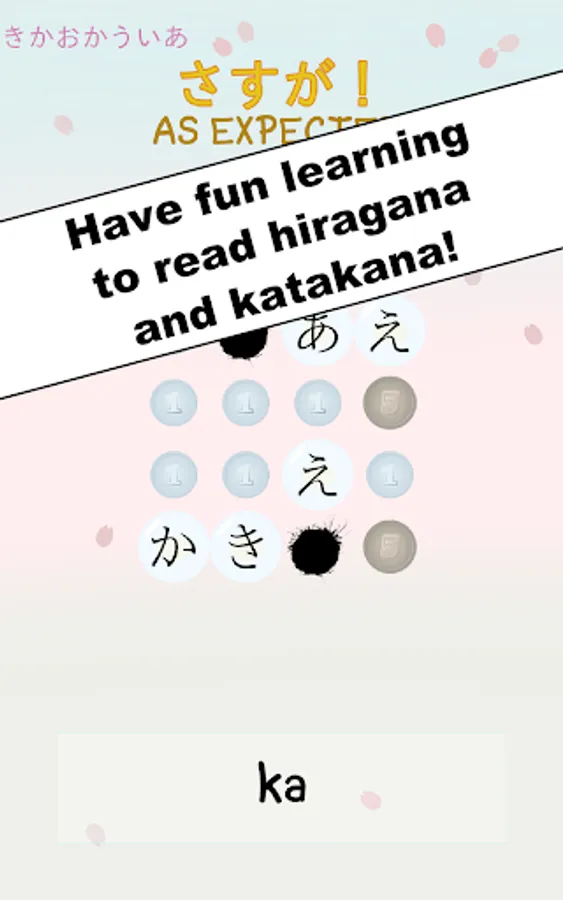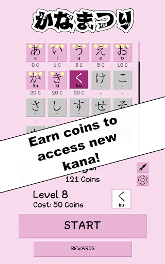 The game is based on puzzles where you will get Coins for properly recognizing the proposed kana. These Coins are then used to access next characters, therefore forcing you into getting good knowledge of previous kana to access new ones. Characters are repeated in the different puzzles to work both short term and longer term memory.