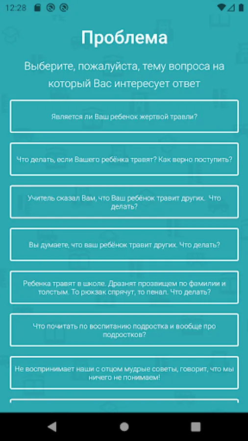 The application highlights the causes and characteristics of a particular problem in children of different age groups. It offers various options for recommendations to solve the problems of the child, taking into account age-related characteristics. Each of the age periods of a child’s life in family life is very important and complex. Expert advice may be needed at any time.