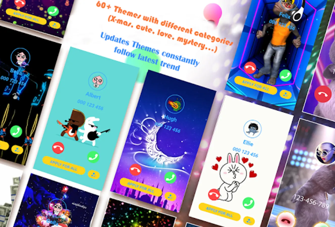 • Various, trendy, hottest call screen themes, call flash and totally free: the most stunning themes will be provided and we keep updating constantly. Different kinds of free stunning call screen themes are here waiting for you: Mystery, Love, Cute, Animals, Horror, Heroes, Funny, Fire…