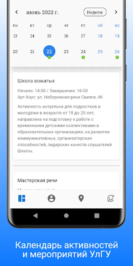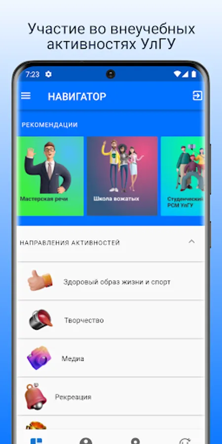 The navigatorULSU mobile application is intended for students, teachers, applicants and residents of the Ulyanovsk region to participate in extracurricular activities and events of Ulyanovsk State University