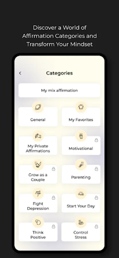 1. Explore 20+ Categories: Whether you're seeking motivation, confidence, stress relief, or love and relationships, we've got you covered. With over 20 carefully curated categories, you can easily find affirmations that resonate with your goals and aspirations.