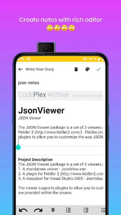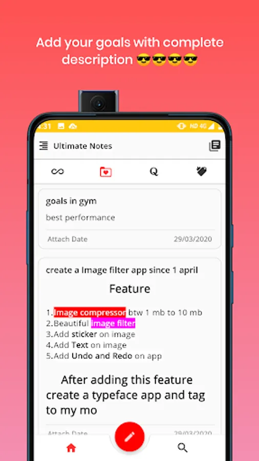 * create notes and goals with rich editor like bold, bullet, color, background text, number, quote, indent and many more