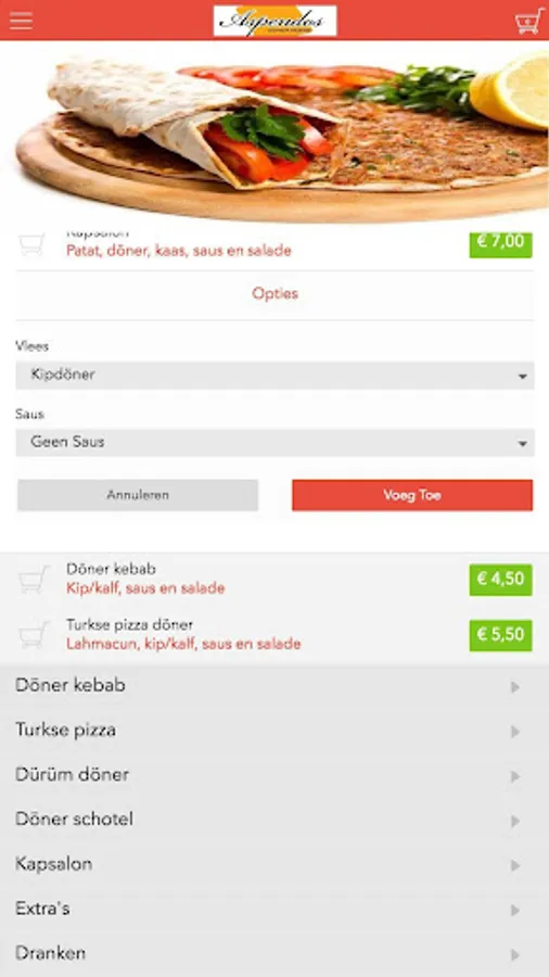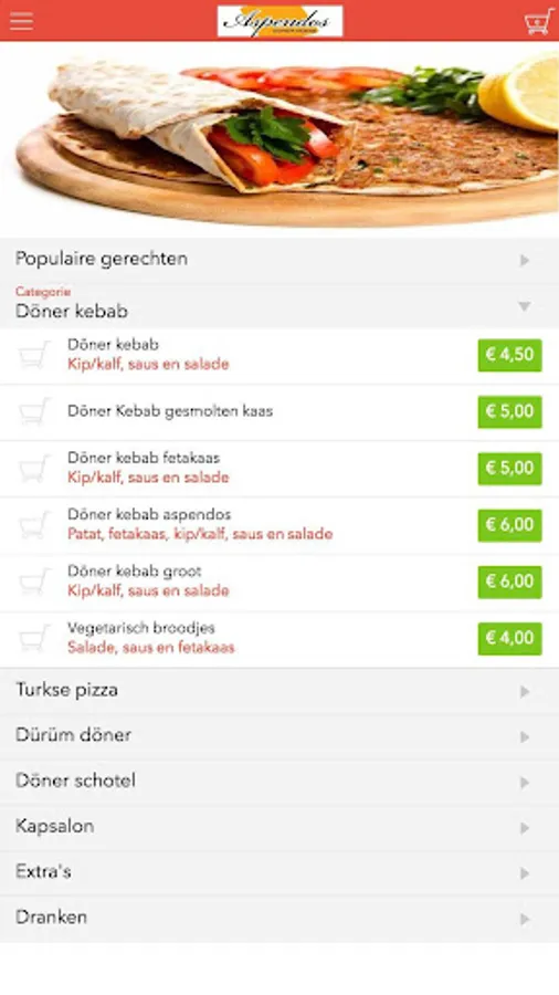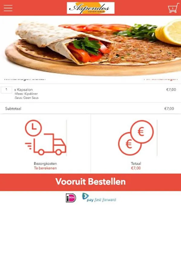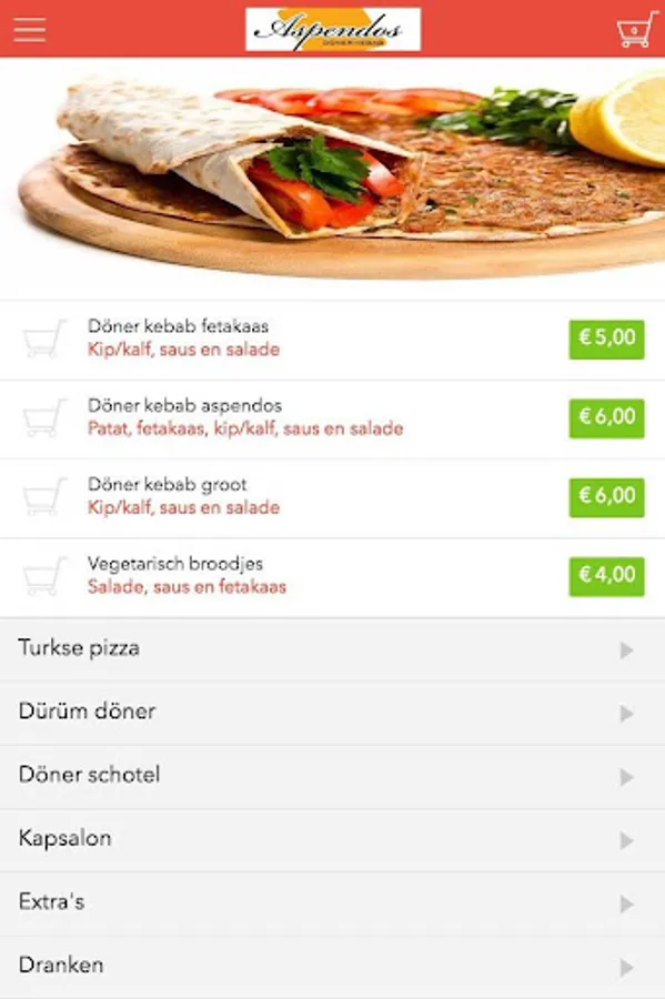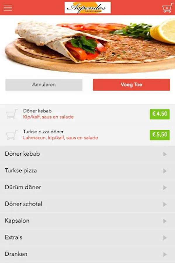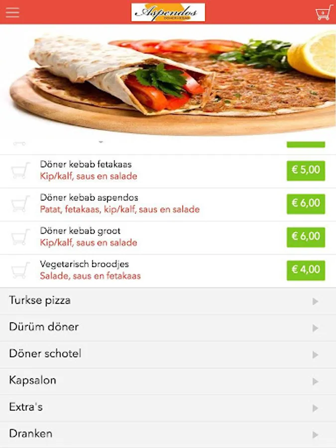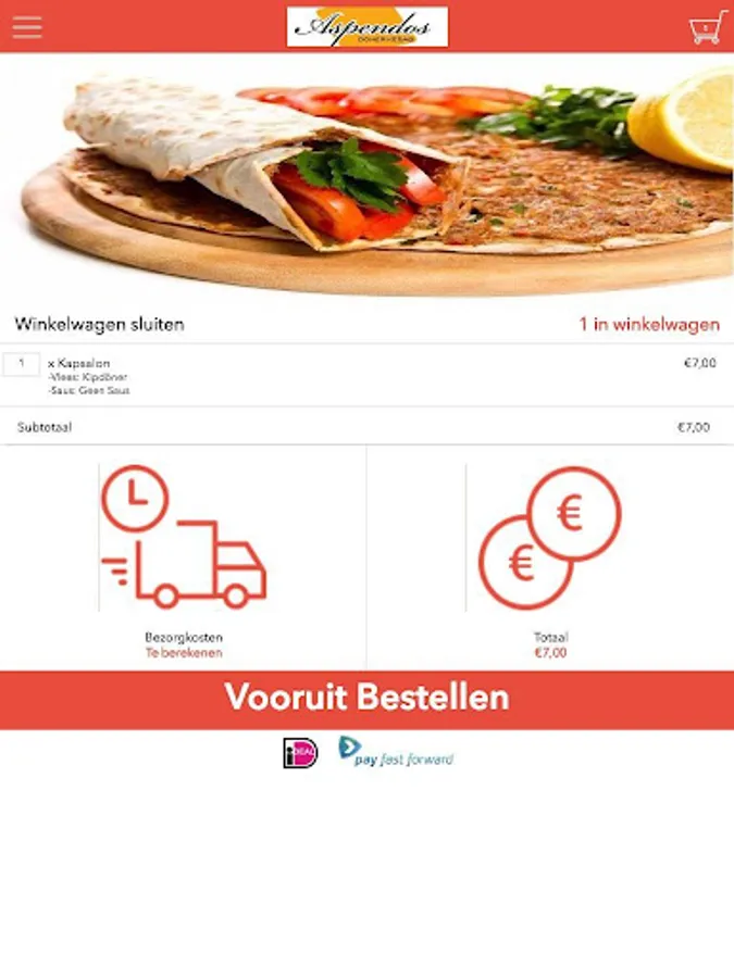 The Aspendos Kampen app is made to be able to place an order easier and faster by means of a simple menu. In the menu you can choose popular dishes, but you can also create a menu yourself.