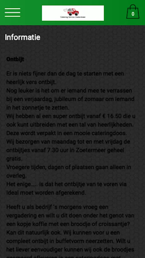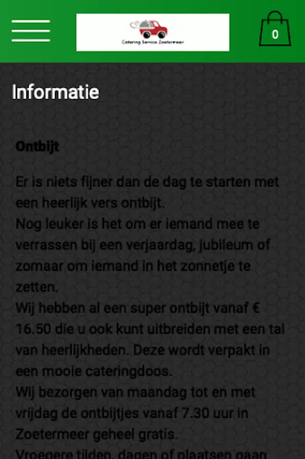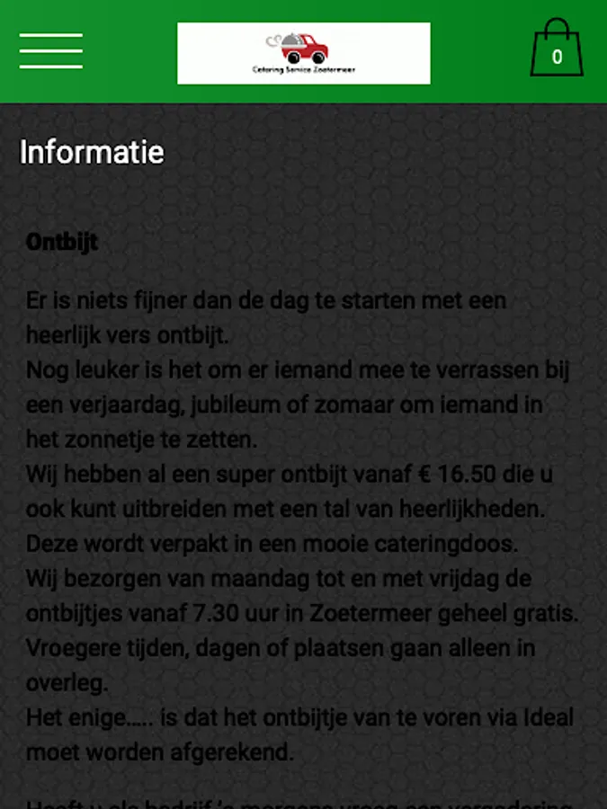The Catering Service Zoetermeer app has been created to make it easier and faster to place an order by means of a simple menu. In the menu you can choose popular dishes, but you can also create your own menu.