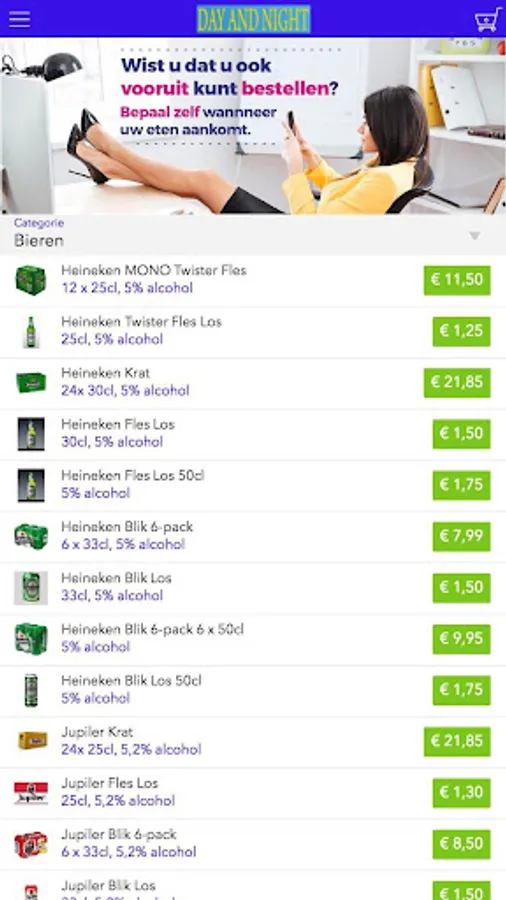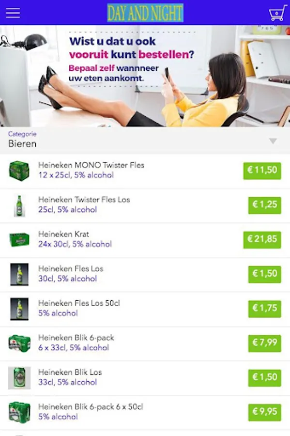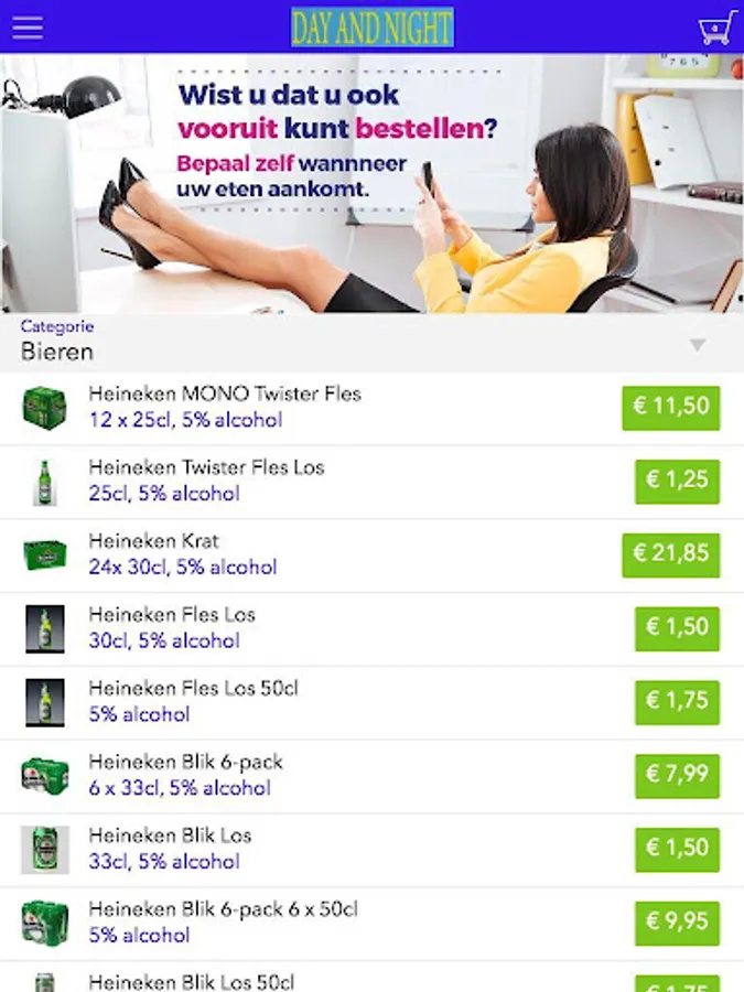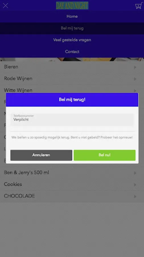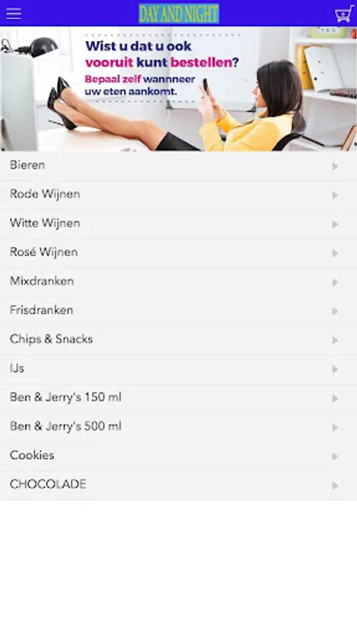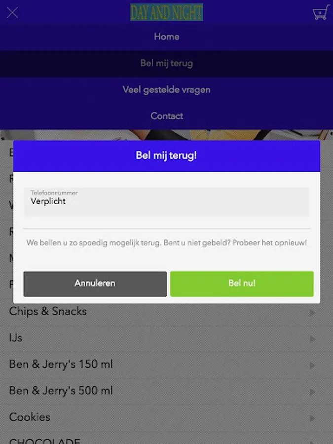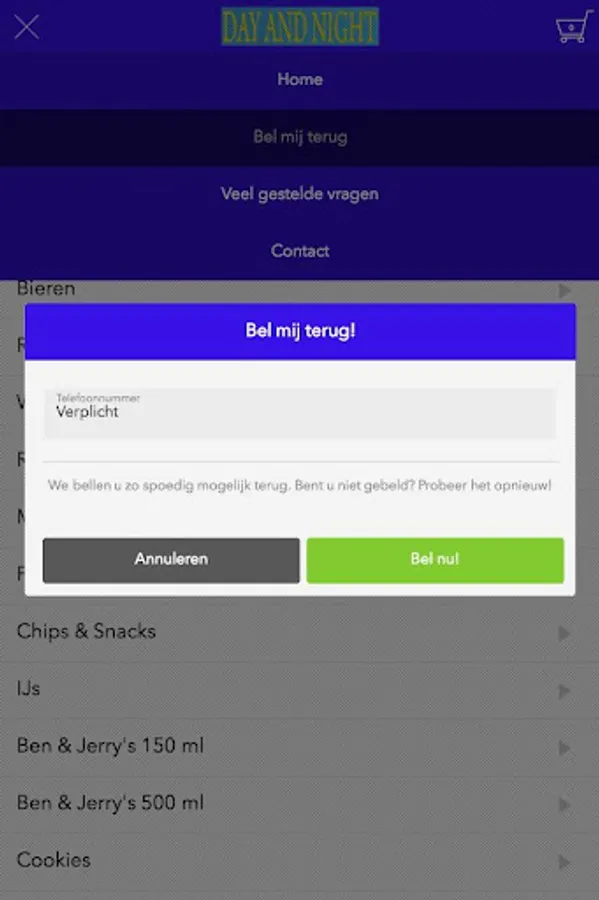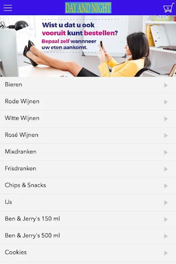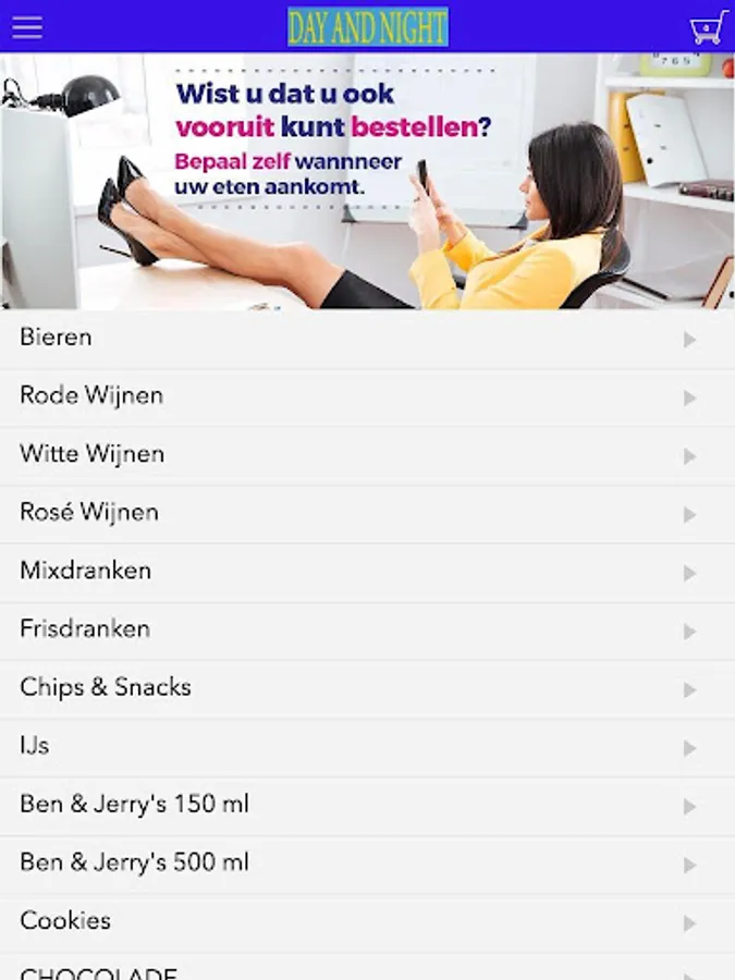 The Day and Night grocery app is designed to be able to place orders easily and quickly by means of a simple menu. In the menu you can choose to include popular dishes, but you can also draw up a menu.