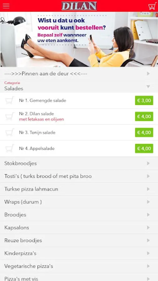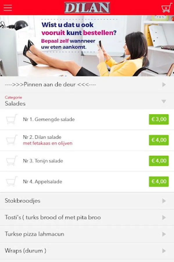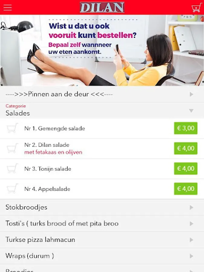 The Eatery Dilan app is designed to be able to place orders easily and quickly by means of a simple menu. In the menu you can choose to include popular dishes, but you can also draw up a menu.