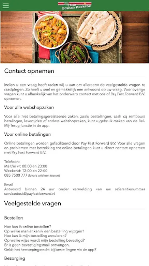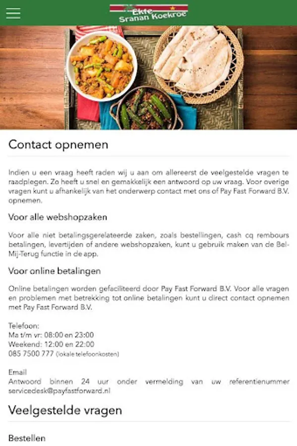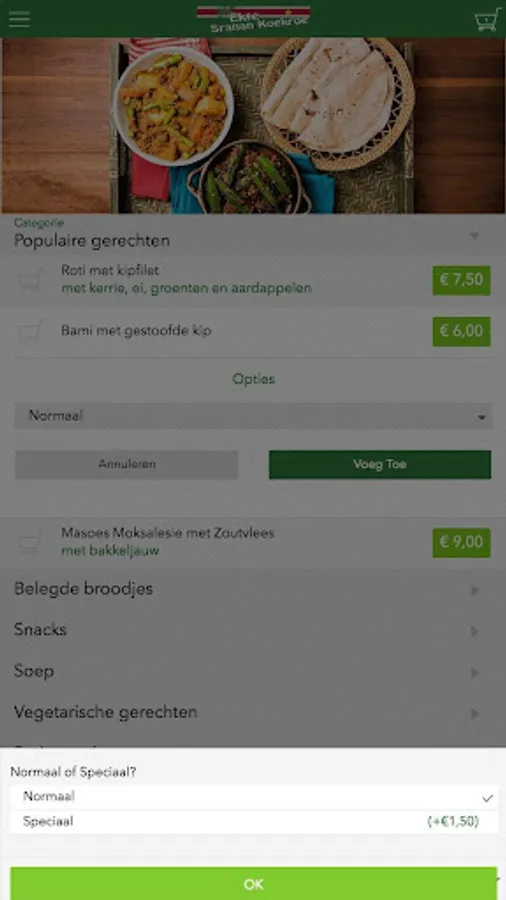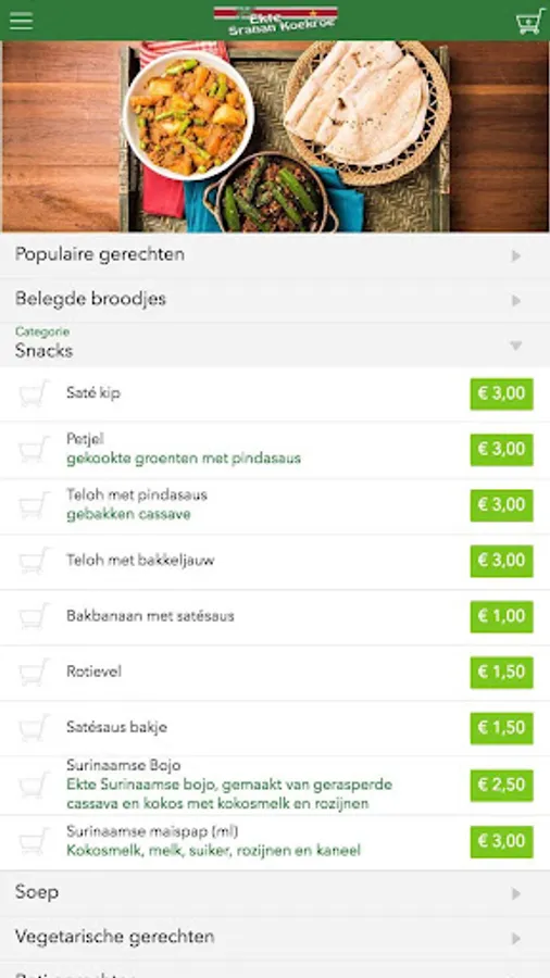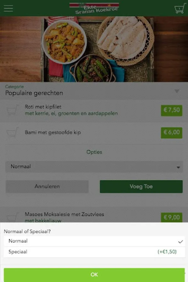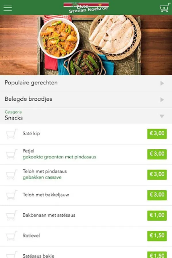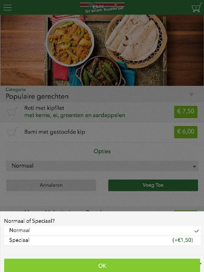 The Ekte Sranang Koekroe app is designed to be able to place orders easily and quickly by means of a simple menu. In the menu you can choose to include popular dishes, but you can also draw up a menu.