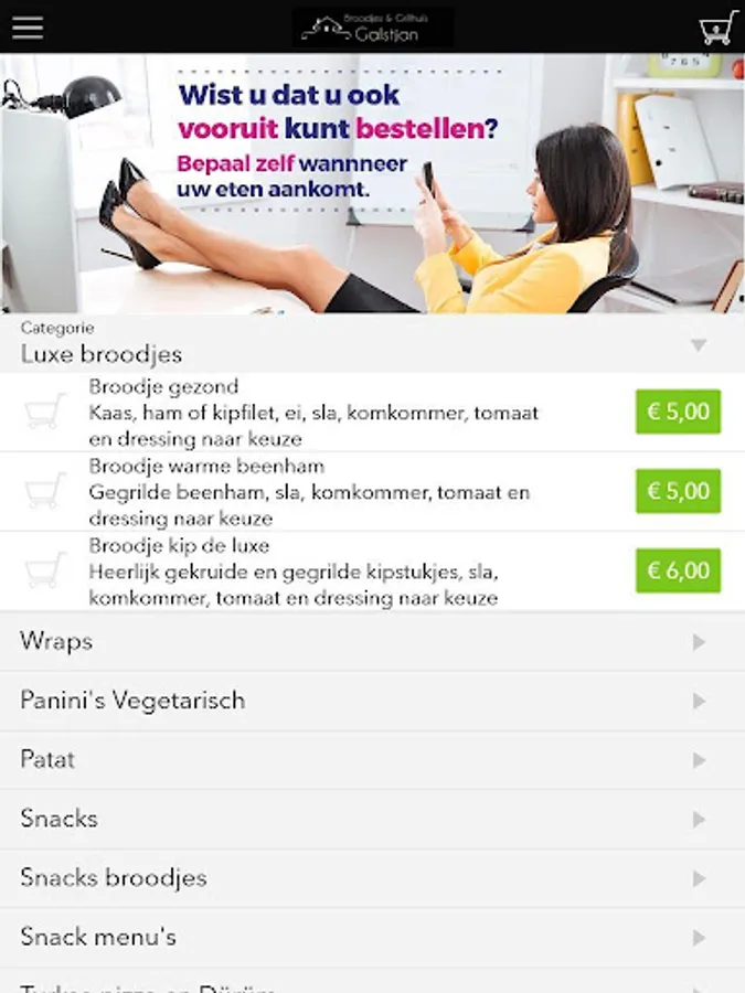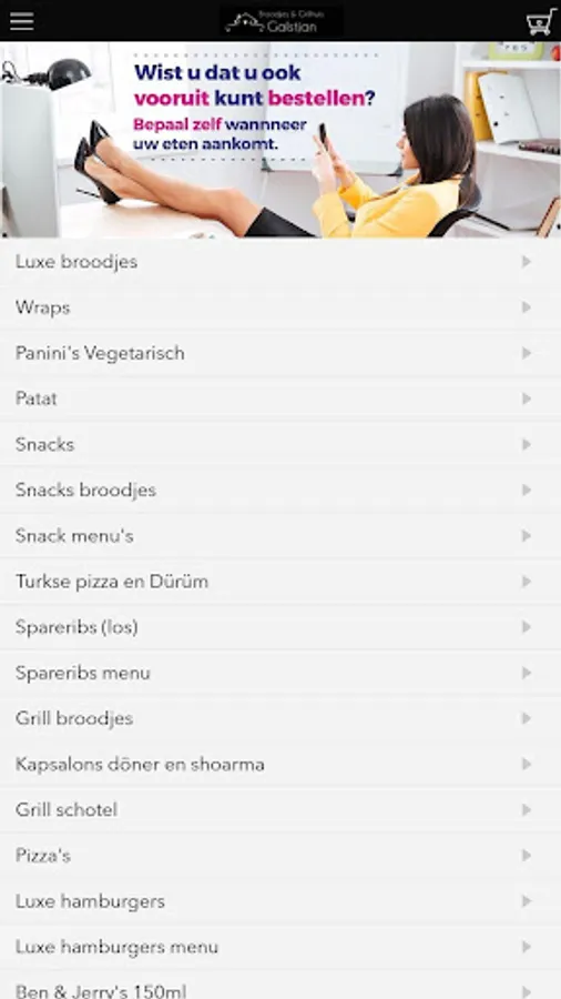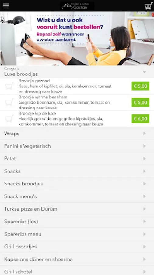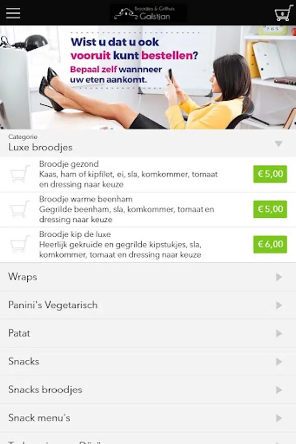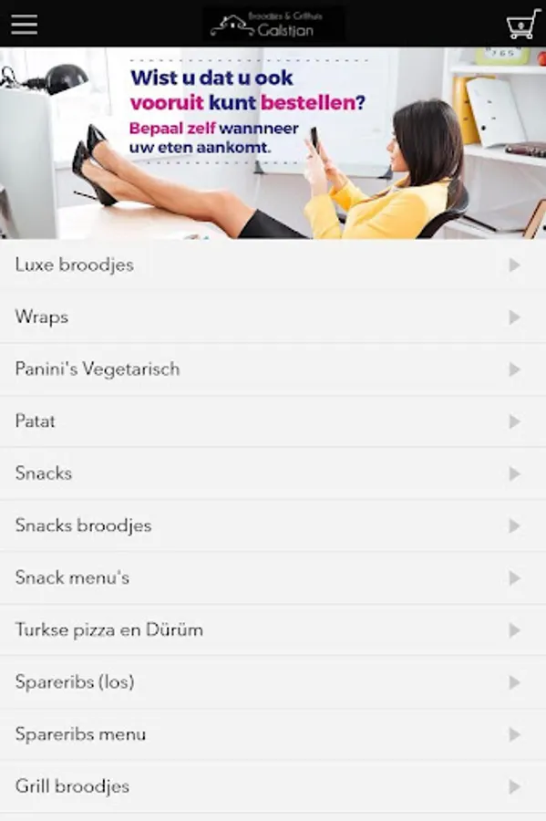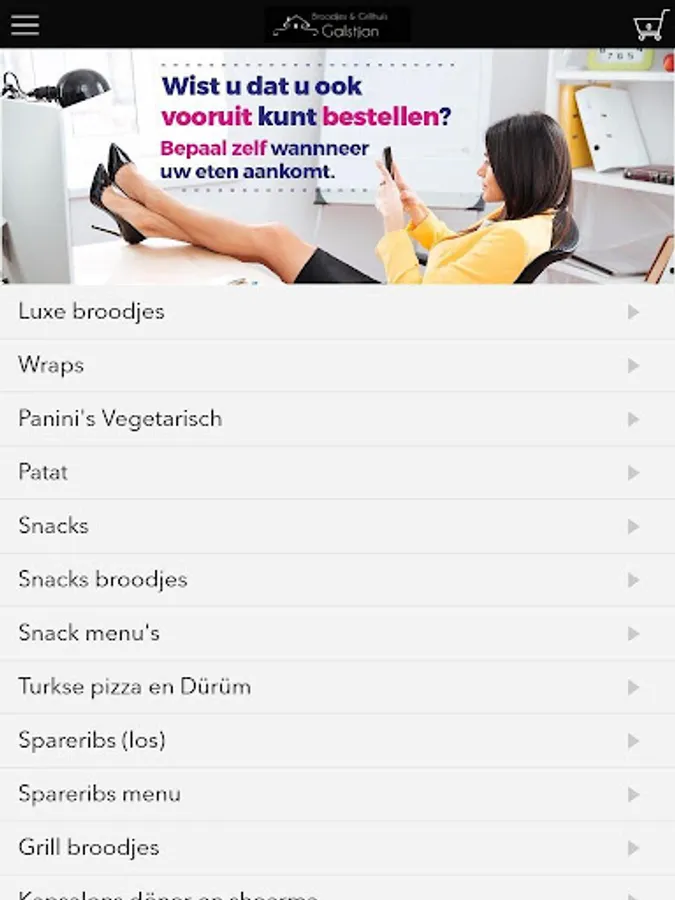 Rolls and Grillhuis Galstjan app is designed to be able to place orders easily and quickly by means of a simple menu. In the menu you can choose to include popular dishes, but you can also draw up a menu.