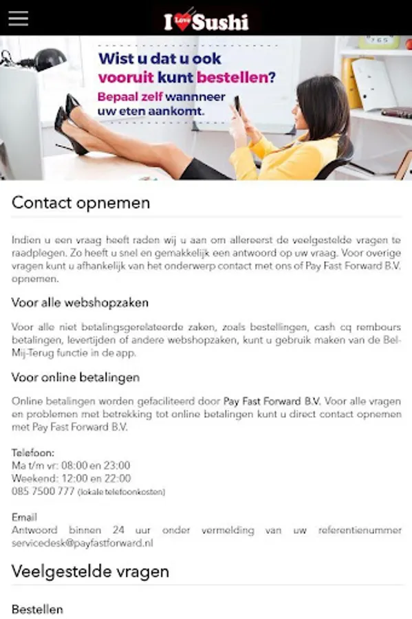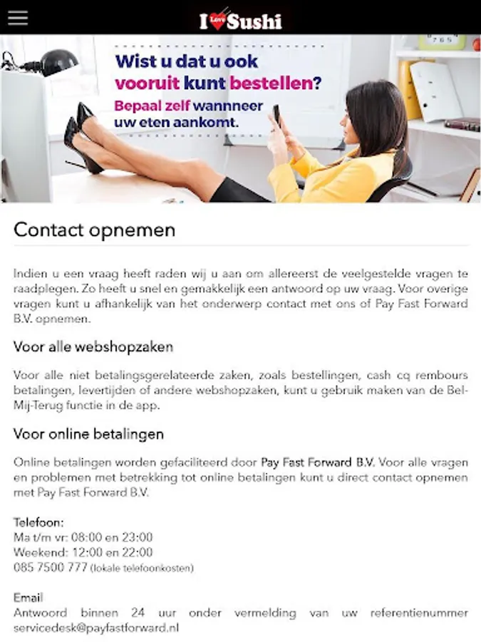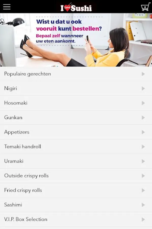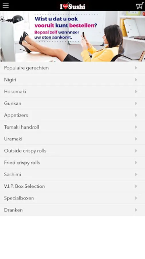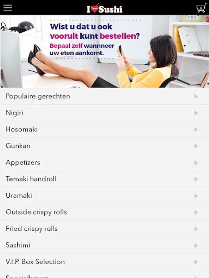 The I Love Sushi Horn app is designed to be able to place orders easily and quickly by means of a simple menu. In the menu you can choose to include popular dishes, but you can also draw up a menu.