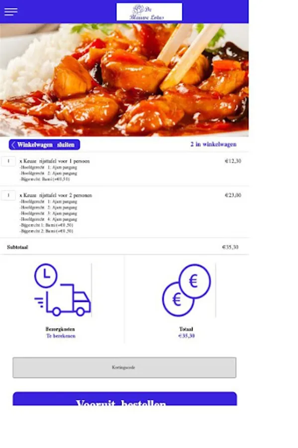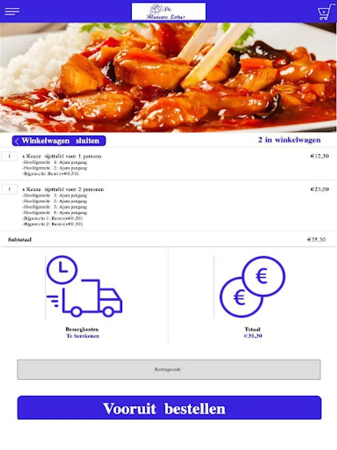 The De Blauwe Lotus app is made to be able to place an order easier and faster by means of a simple menu. In the menu you can choose among other things for popular dishes, but you can also prepare a menu yourself.