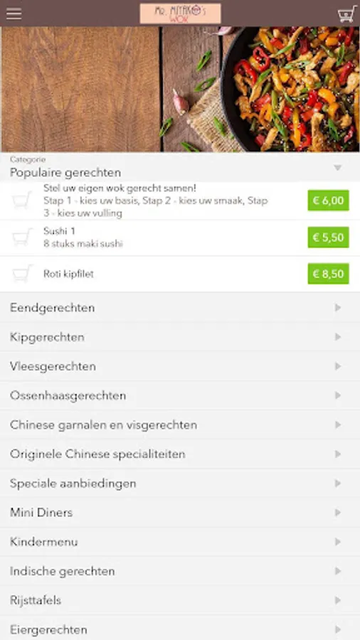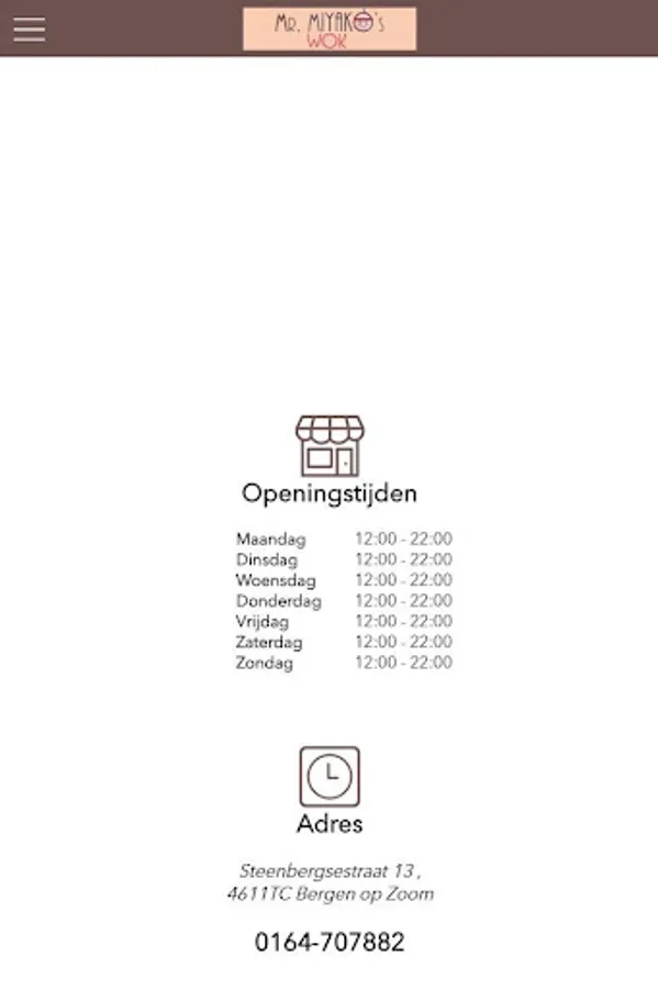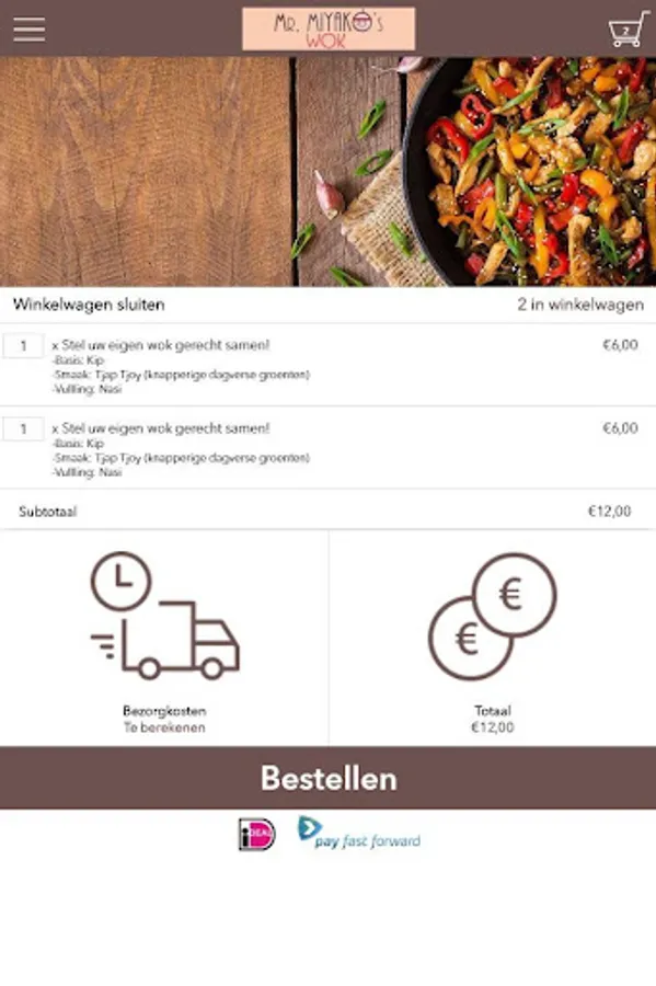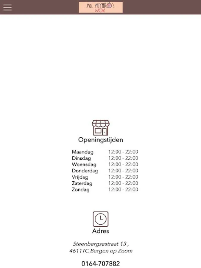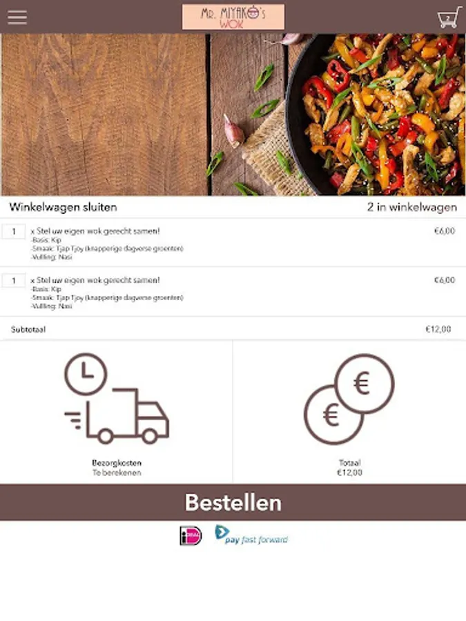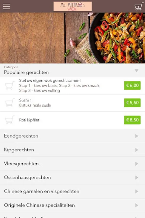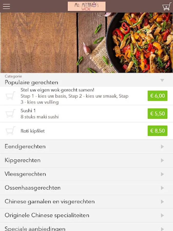 The Miyakos Mr. Wok and Go app is designed to be able to place orders easily and quickly by means of a simple menu. In the menu you can choose to include popular dishes, but you can also draw up a menu.