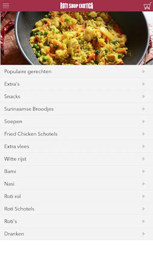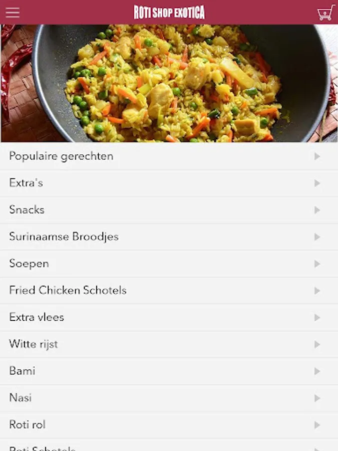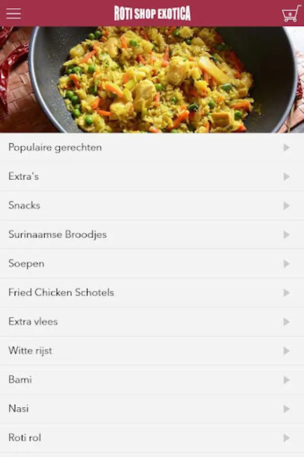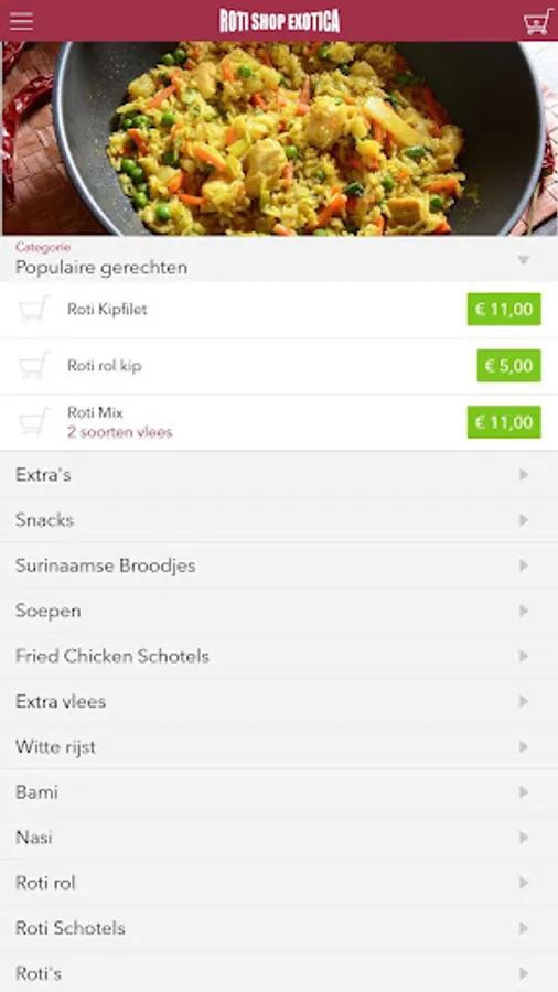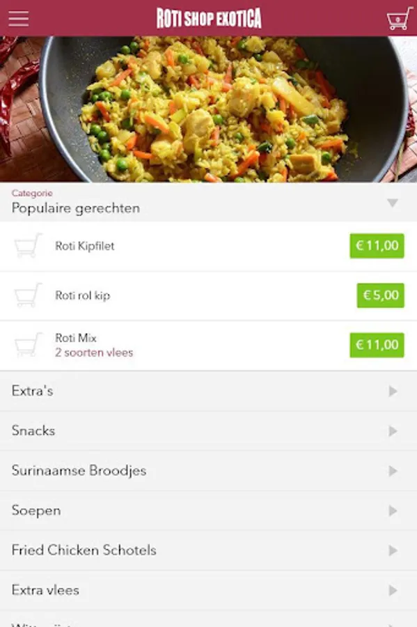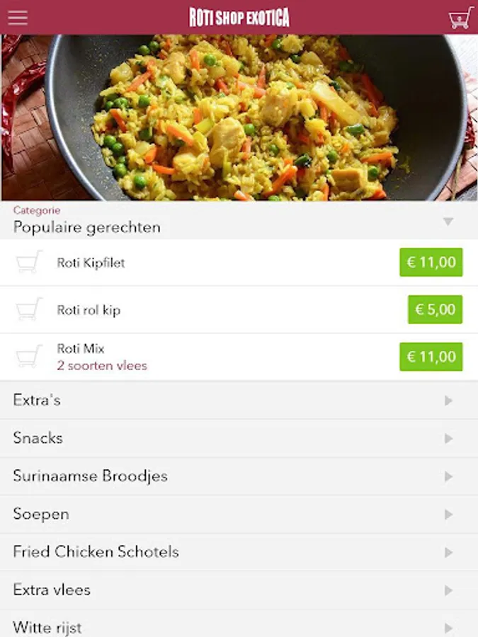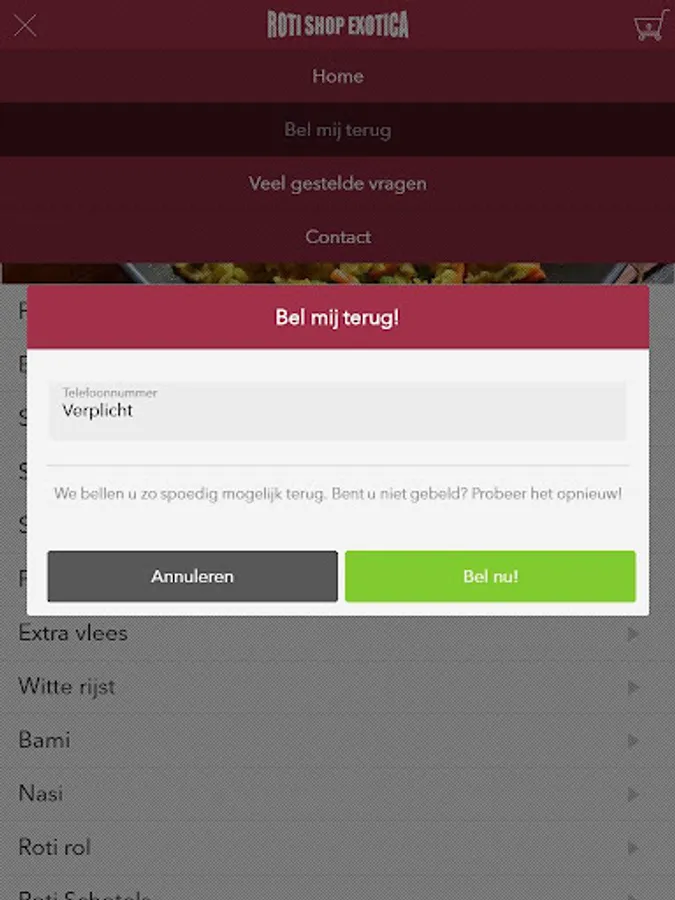 The Roti Shop Exotica app is designed to be able to place orders easily and quickly by means of a simple menu. In the menu you can choose to include popular dishes, but you can also draw up a menu.