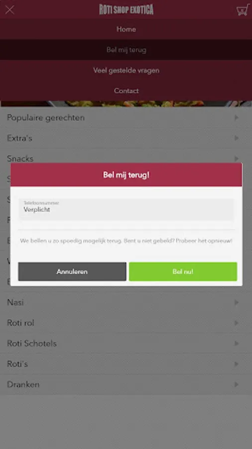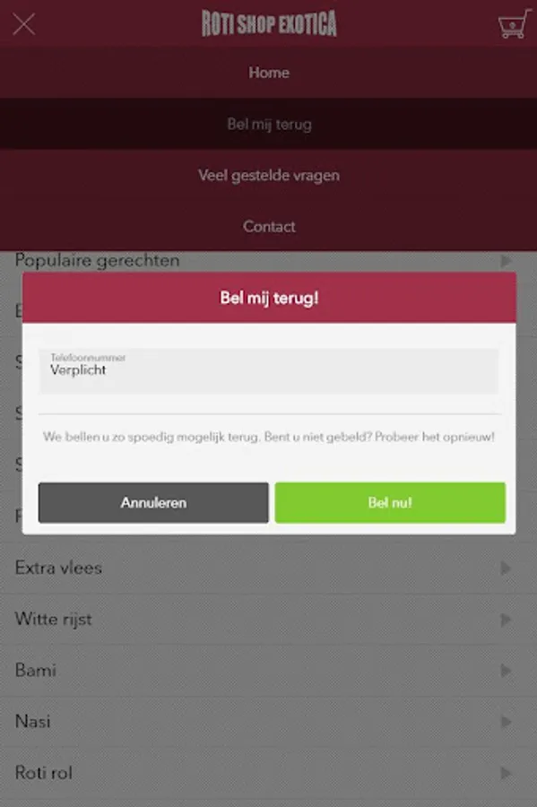 Do you have a question and / or comment on a particular dish and you want to be called back by us? You can do this by pressing the '' Call me back 'button and you will be free of charge called back by us!