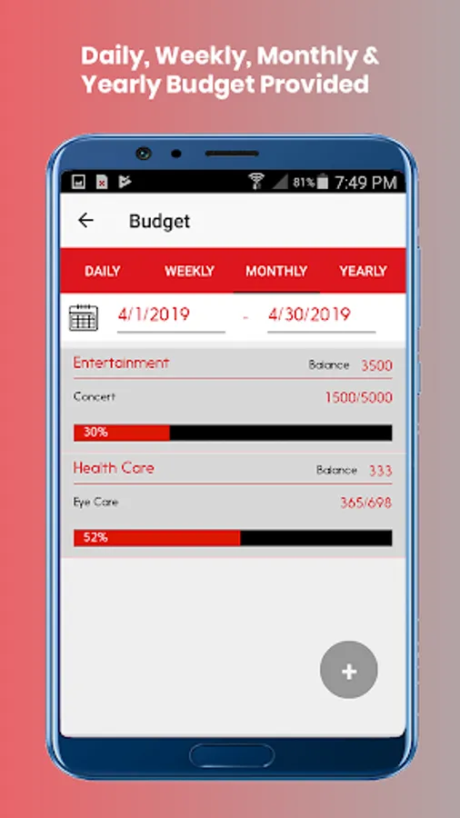 • Daily, weekly, monthly, and yearly budget with progress bar