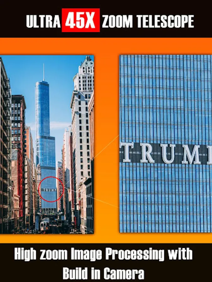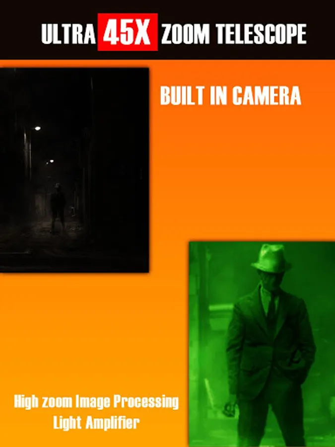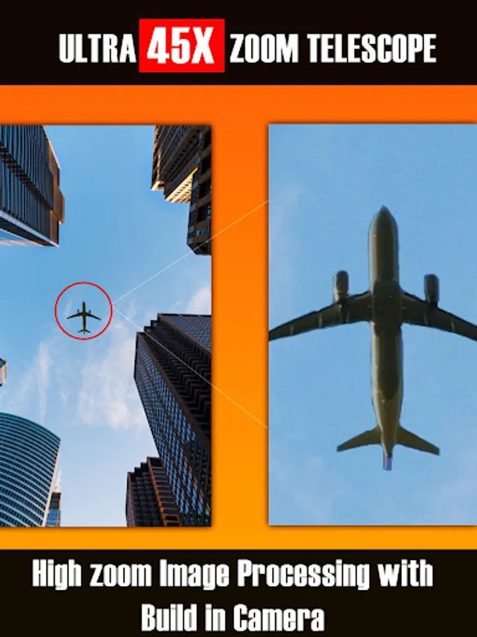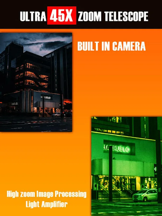 Ultra Zoom Telescope HD Camera is an advance zooming Camera buit-in radius app that allows you to see the faraways objects. There are different color filters for the night time objects contrasted photo shooting. you can also use it as a Microscope, Binoculars, Magnifier, Ultra Zoom and much more with autofocus Flash Light. There are three main features , first is night mode, you can use this app in night , second feature is brightness : you can change the brightness of the camera, third is Zoom , You can Zoom the camera up to zoom, which make more accurate visibility of so far objects.