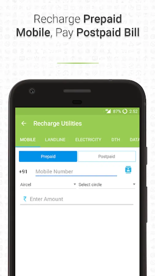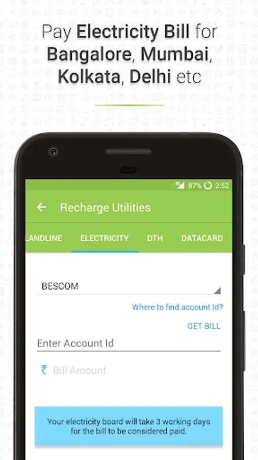 • Pay Postpaid Mobile, Landline, DataCard and BESCOM bills