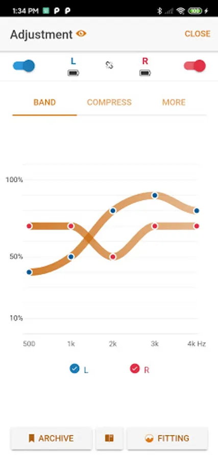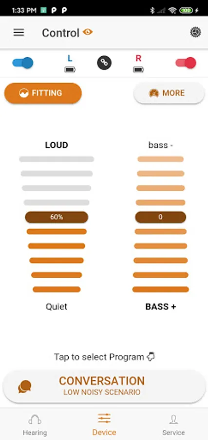o Users have on the fly control of the hearing device's fine-tuning features, including volume level, tone, and frequency gain equalizers for each ear.