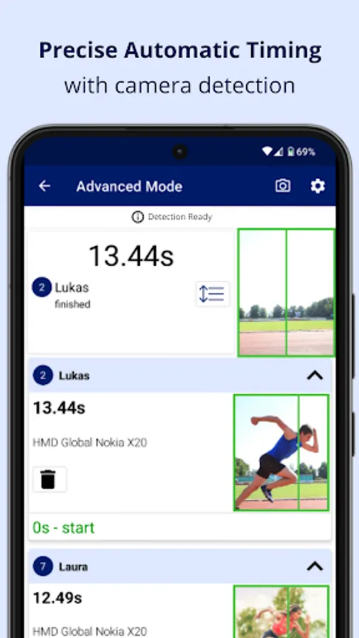 A single phone can automatically measure lap times with high precision As athletes pass, their chests are detected, and a photo finish image is captured. This method eliminates the timing inaccuracies found in laser systems, which can be triggered by hands or thighs.