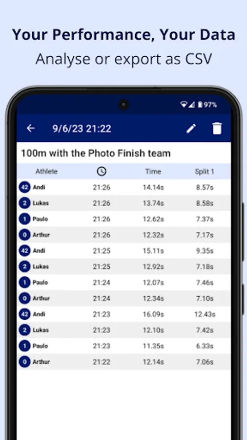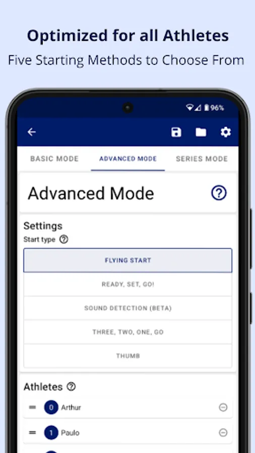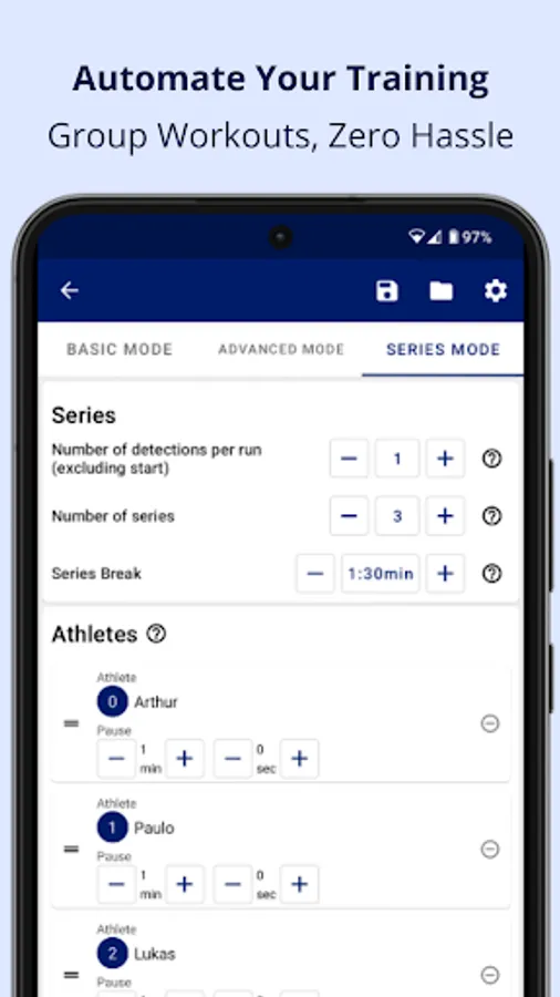 Predefine your training sessions and the participating athletes in the Automatic Series Mode. Once set, there's no need to interact with the phones during training. Voice commands announce the next athlete, and all performances are recorded hands-free!
