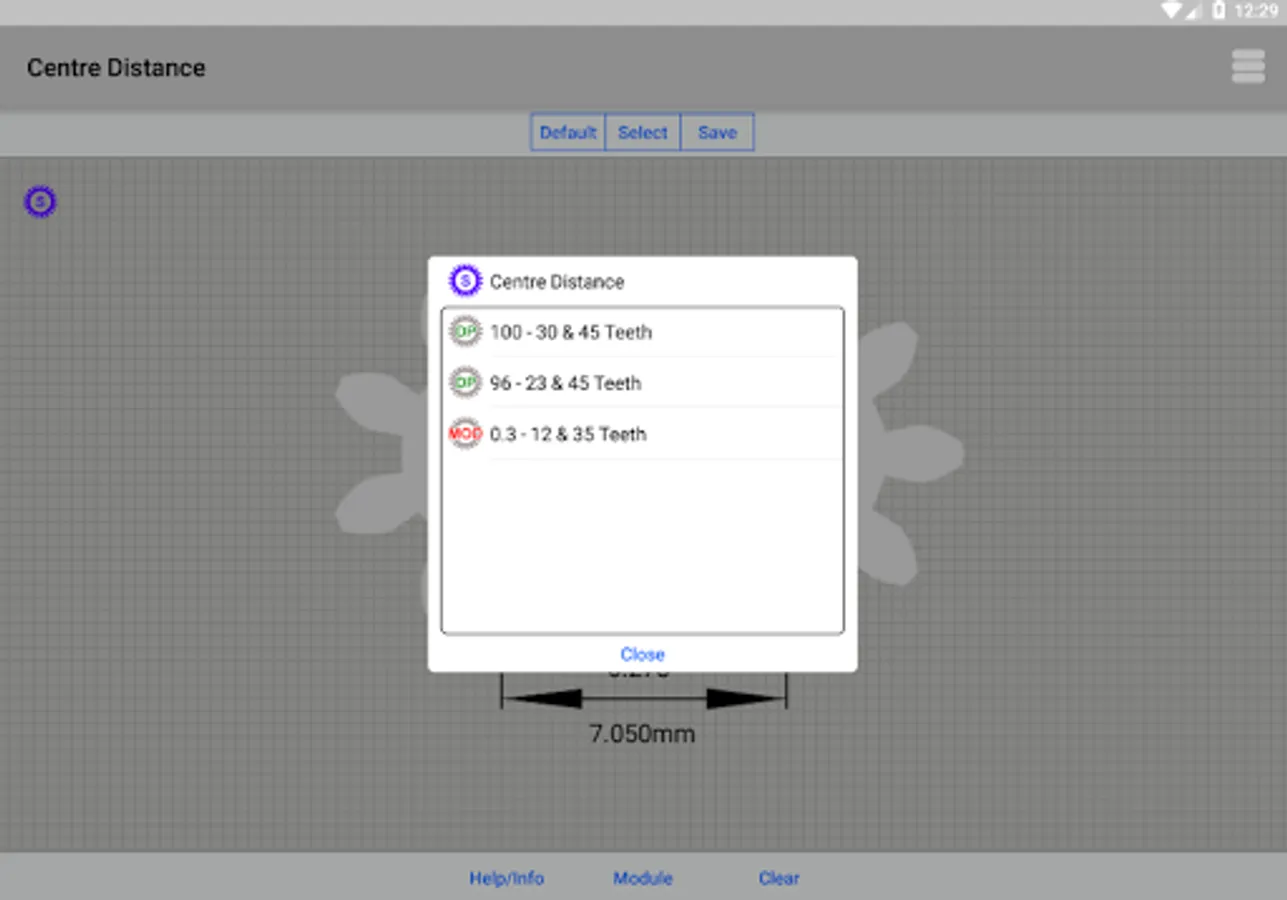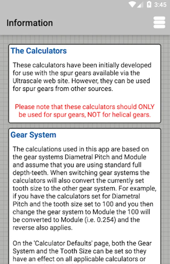 The two gear systems used in this app are Diametral Pitch and Module and assume you are using standard full depth-teeth. When switching gear systems the calculators will also convert the currently set tooth size to the new gear system. For example if you have the calculators set for Diametral Pitch and the Tooth Size set to 100 and you then change the gear system to Module the 100 will be converted to Module (i.e. 0.254) and the reverse also applies.