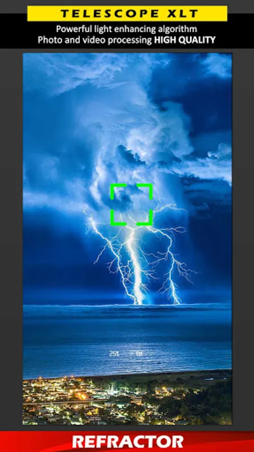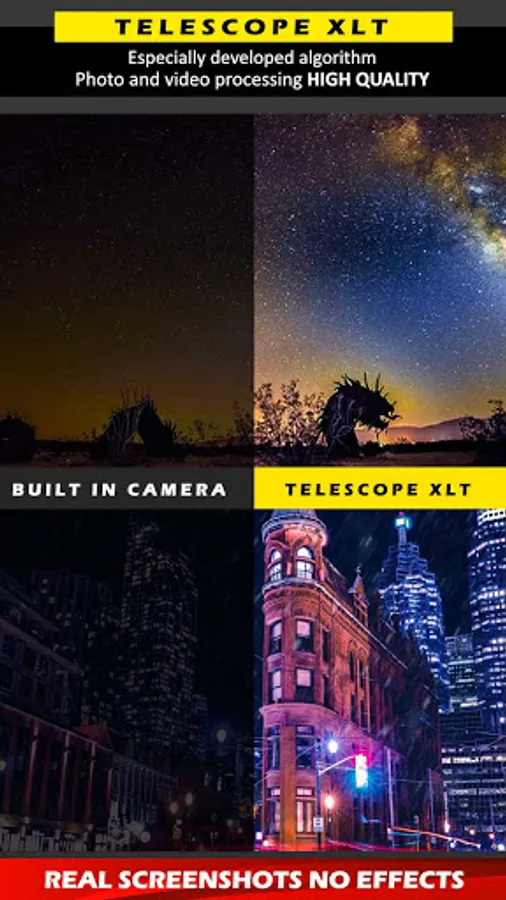ultra zoom telescope xlt photo and video specially developed for telescope camera with the most advanced algorithms which allow you to see the faraway objects very easily. there are amazing multiple filters for the night view objects contrasted photo and video shooting. you can also use it as a binoculars, magnifier, monocular, microscope, ultra zoom, point shooting, gopro, and much more with flashlight and autofocus. there are three major features, first is night mode, you can use this application at the night for brighter and clear pictures, the second feature is brightness: you can change the brightness of the camera for a perfect result, the third one is optical and digital zoom, you can zoom the camera up to the maximum zoom, which makes more accurate visibility of so far objects.