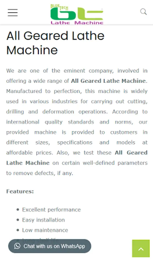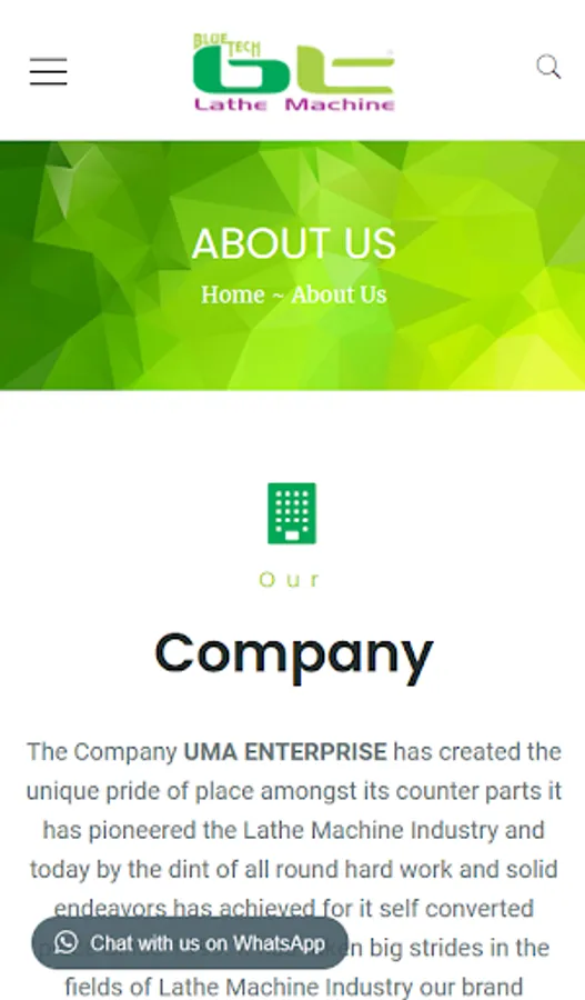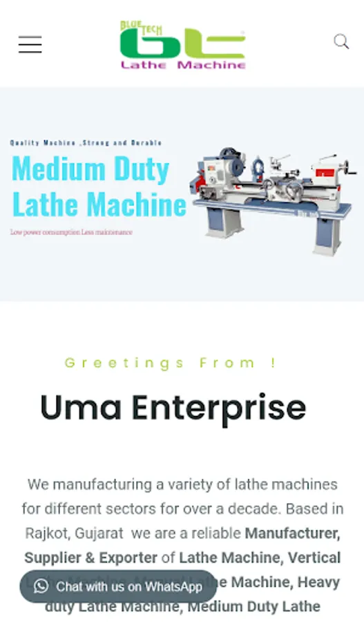 The Company UMA ENTERPRISE has created the unique pride of place amongest its counter parts it has pioneered the Lathe Machine Industry and today by the dint of all round hard work and solid endeavors has achieved for it self converted place Since 1999. It has taken big strides in the fields of Lathe Machine Industry our brand is BLUE-TECH. It is an Unique and it self shows. The Symbol of Quality Accuracy and Service Our Motto is To Provide Quality Beyond Imagination and To Highly Satisfy our Customer by Providing Better Service and Better Product.