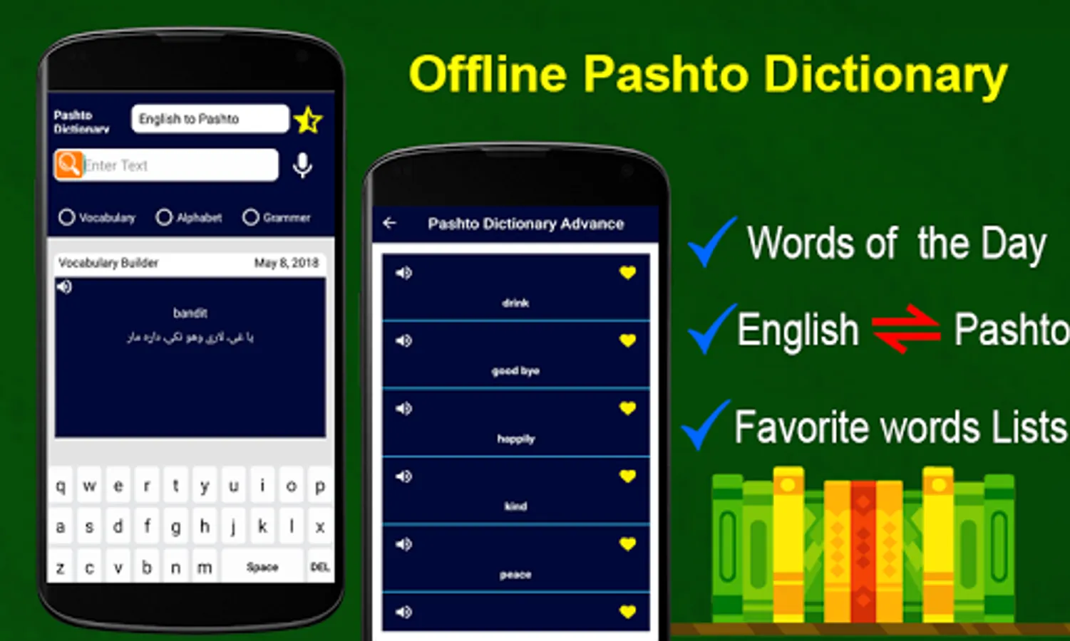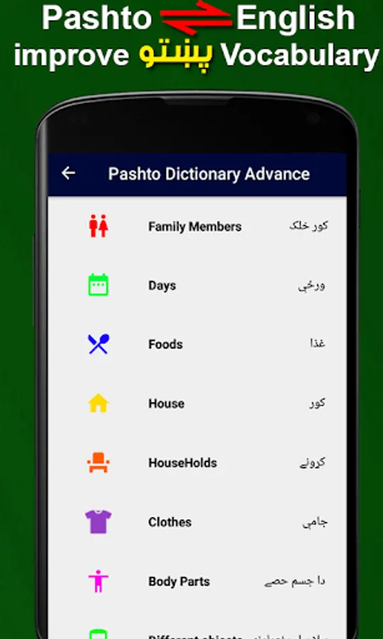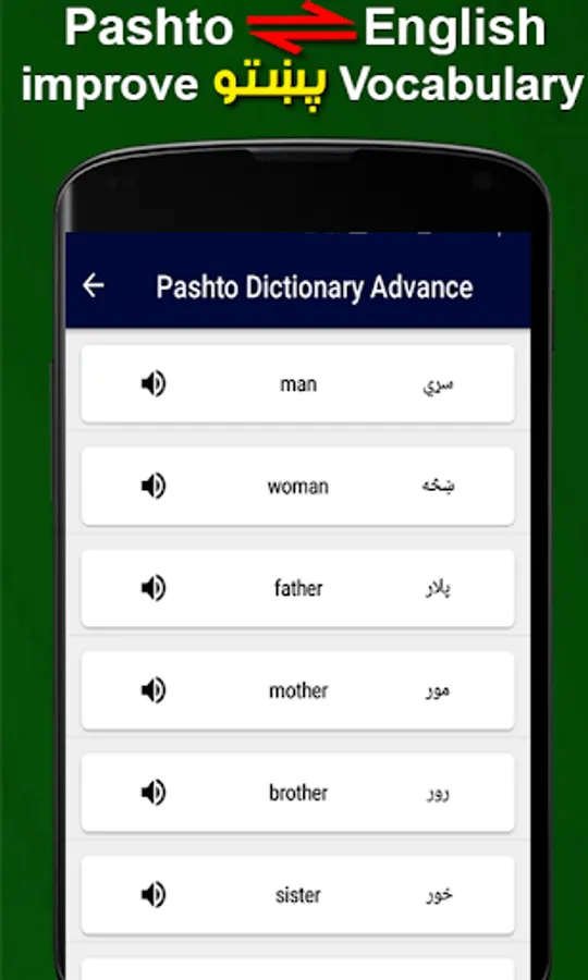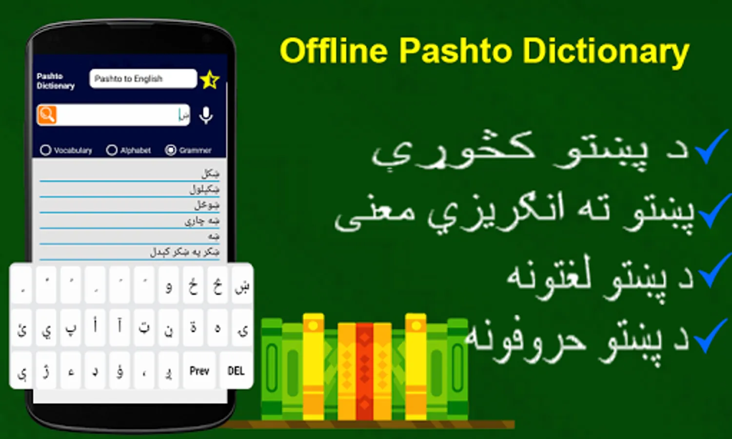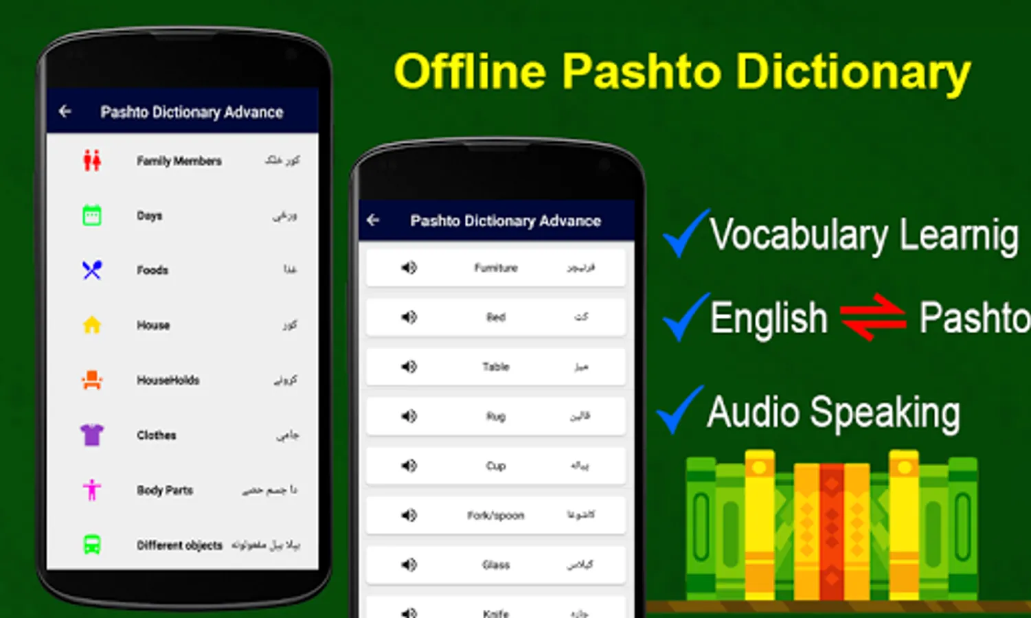 Offline Pashto Dictionary Pashto Vocabulary is providing best Feature of Pashto Vocabulary where you can find Pashto and English words Translations. you can see words meaning in Pashto and English. Pashto Vocabulary contains of the following things.
