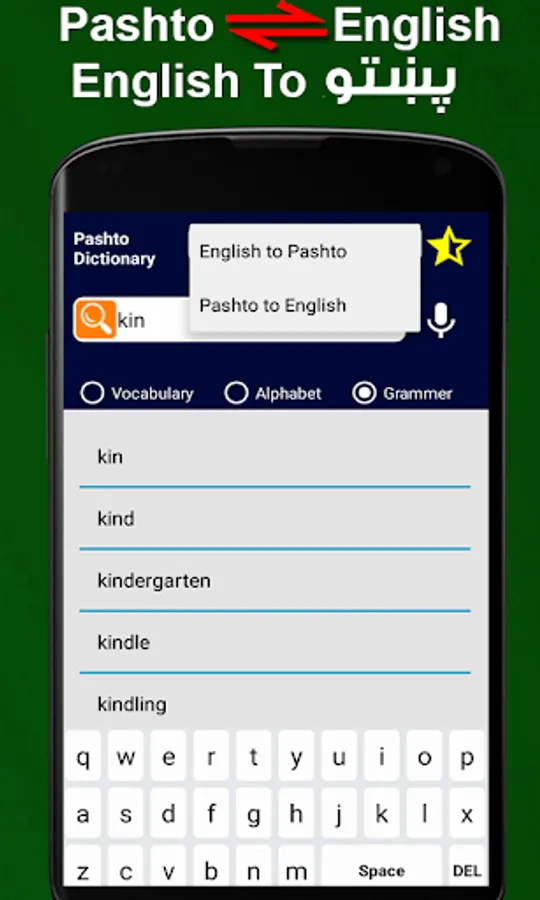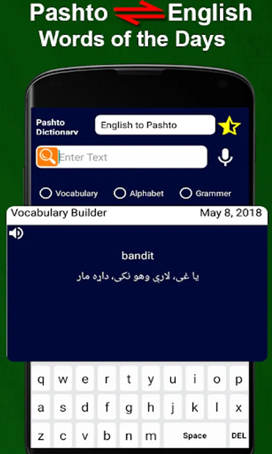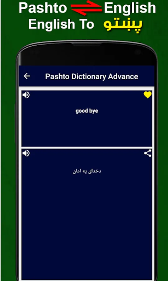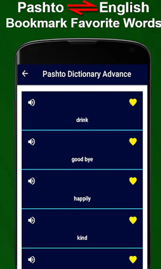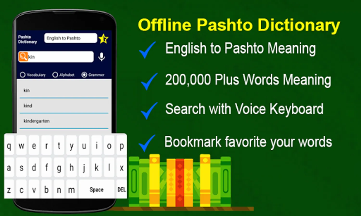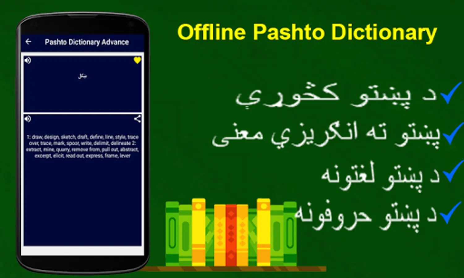 Offline Pashto Dictionary Pashto Vocabulary is providing best Feature of Pashto Vocabulary where you can find Pashto and English words Translations. you can see words meaning in Pashto and English. Pashto Vocabulary contains of the following things.