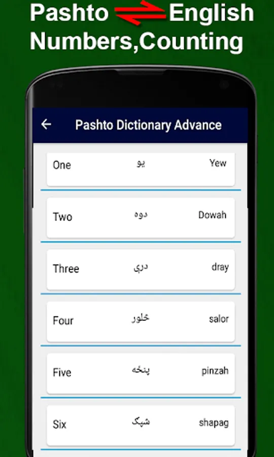 Pashto to English and English To Pashto Counting are presented that providing good opportunity to learn Now Pashto to English and from English To Pashto Counting. That will be most helpful to learn basic of Pashto and English Languages.