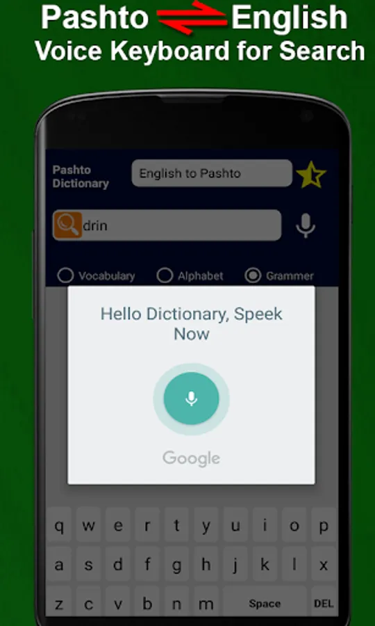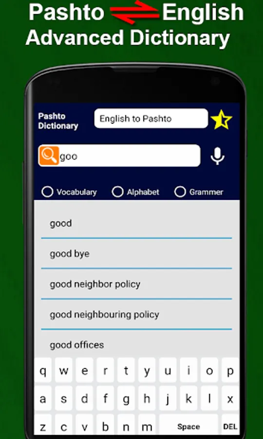 Advanced features of Offline Pashto Dictionary Pashto Vocabulary is that you can find words meaning now by writing words through voice keyboards mean press the mice button and speak your desired words then Dictionary will write your speaking words in text from and gives you words meaning .To find words meaning through voice keyboards that is most efficient features of Offline Pashto Dictionary Pashto Vocabulary.