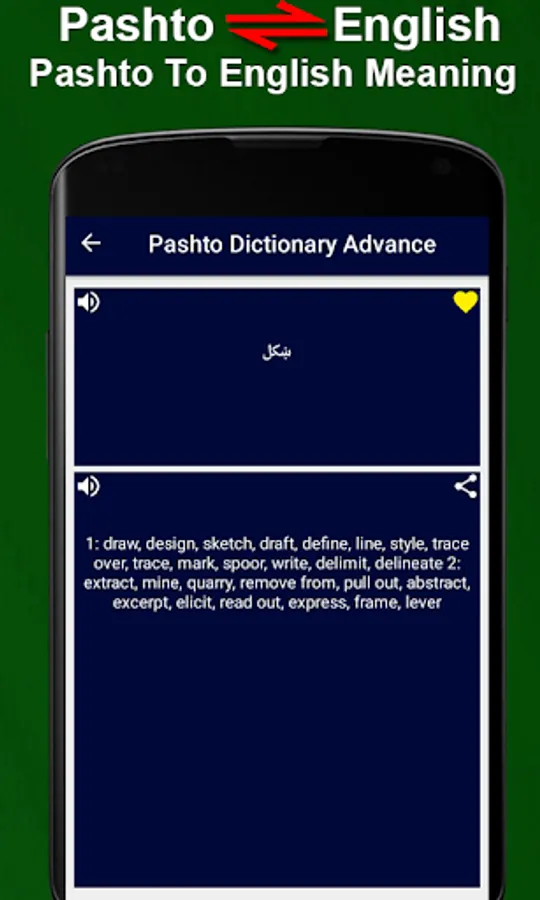 If you are searching best Pashto dictionary that gives you words meaning from Pashto Languages to English Language and from English to Pashto Language, then you should use Offline Pashto Dictionary Pashto Vocabulary one of the best Pashto Dictionary for Pashto Learning. Pashto Dictionary now providing details words meaning in Pashto and English. Pashto Dictionary with more than 200,000 words meaning offer you to learn Pashto to English and from English to Pashto. Fast Suggestion based words searching just type words and Pashto Dictionary automatic provides you words suggestion where you can easily pick you desired words to find the meaning. Offline Pashto Dictionary Pashto Vocabulary is a leading Dictionary for people who wants to learn Pashto to English and for those who wants to learn English from Pashto.