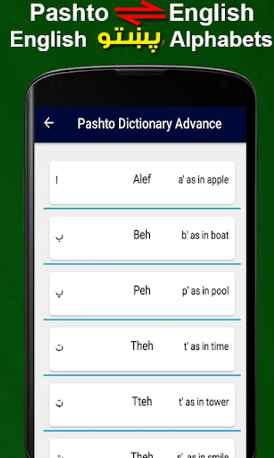 Pashto Alphabets Learning are presented in Offline Pashto Dictionary Pashto Vocabulary where you can learn Pashto English Alphabets with Examples best Pashto Dictionary for people who wants to learn Pashto and English