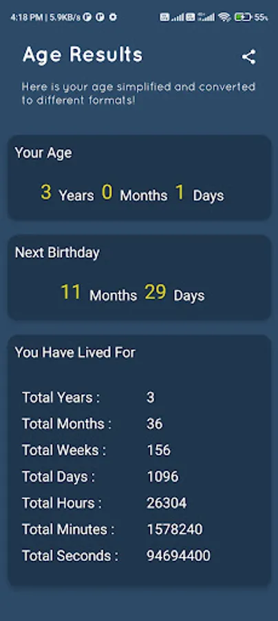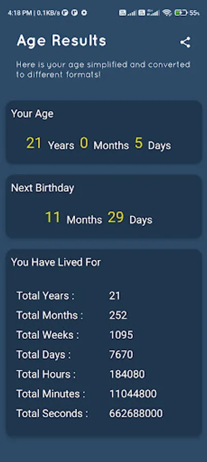 You all fill various forms in your life which asks for your accurate age, and to answer this you keep wondering 'How Old Are You?' And to quench this thirst of 'How Old Am I?' this age app comes in handy, you will know the exact seconds, minutes, hours, days, weeks, months, years you have lived so far with a very easy share button to share this detailed exact age to anyone you want on any social media channel you want.