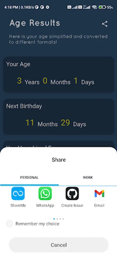 This easy calculator app also enables you to share your exact age, upcoming birthday and time you have lived for, to your friends, families, colleagues through any social media channel.